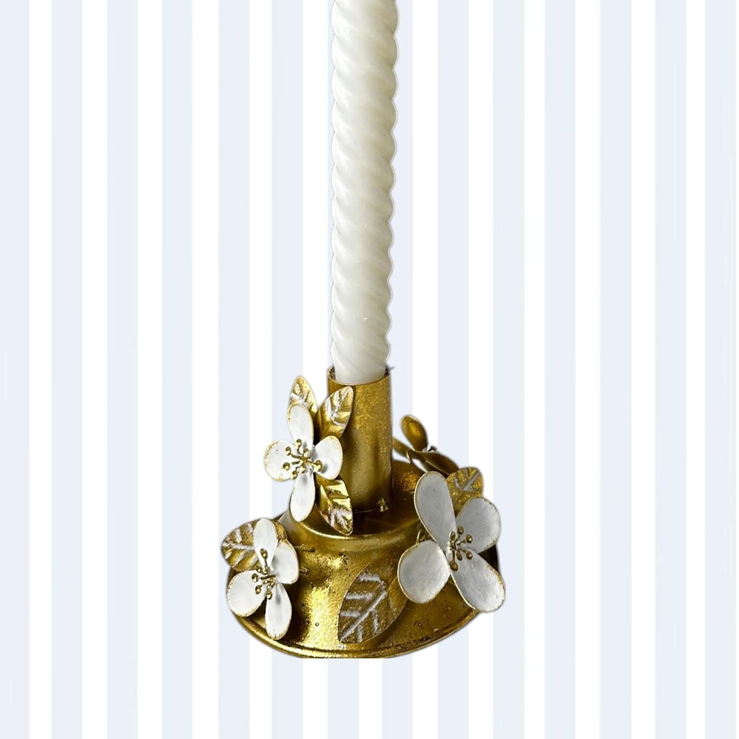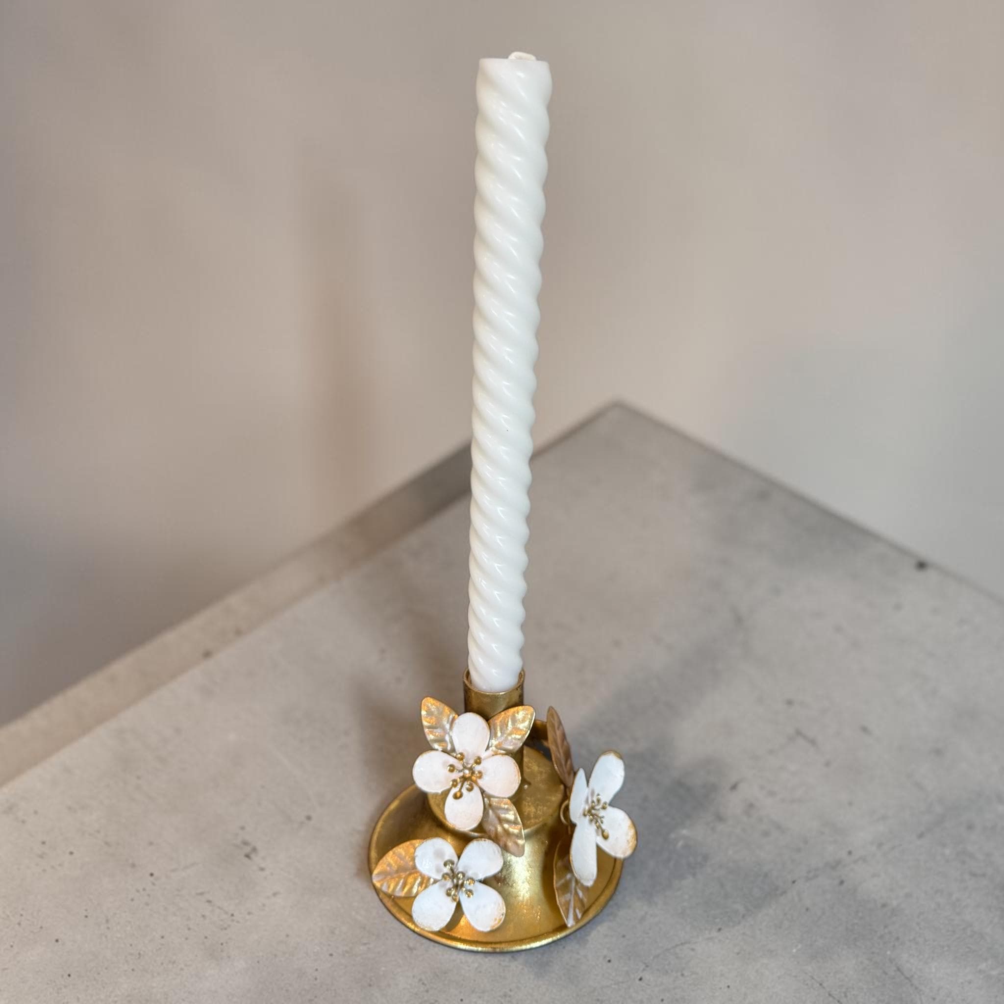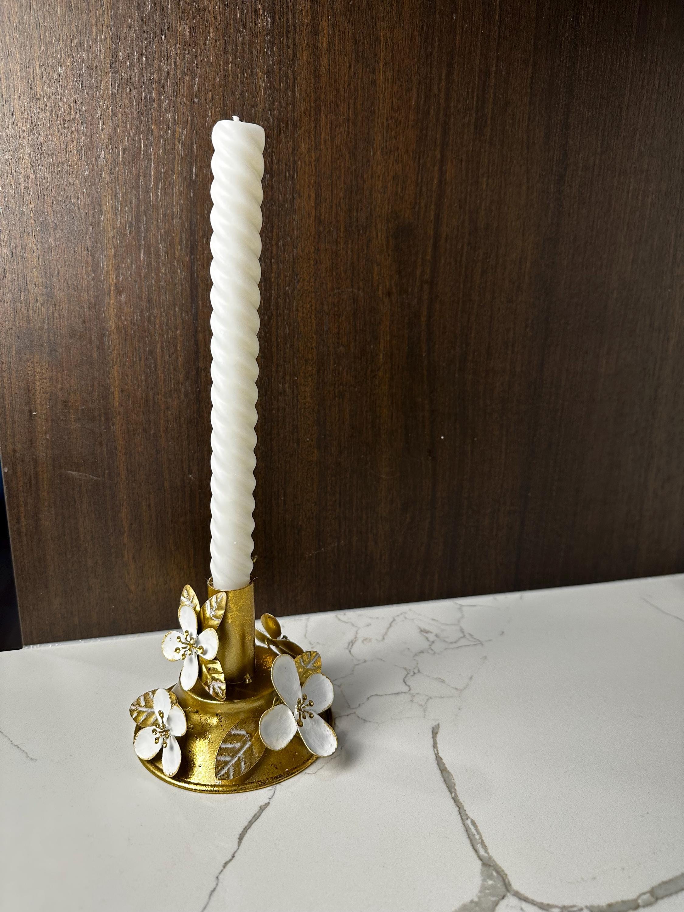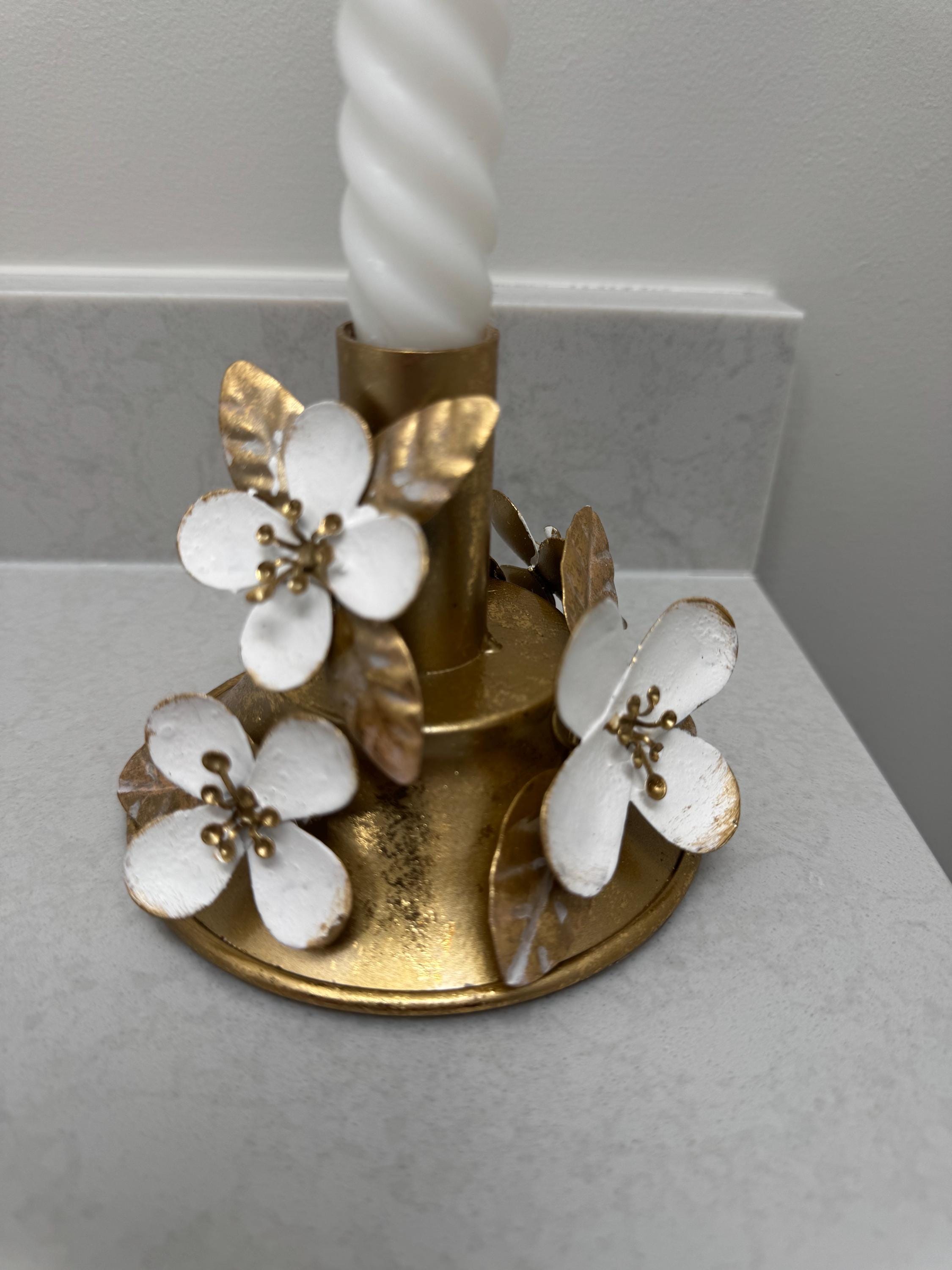 vintage-style brass candle holder with floral embellishments, featuring white enamel flowers and gold-toned leaves. The candle included is a spiral taper candle.