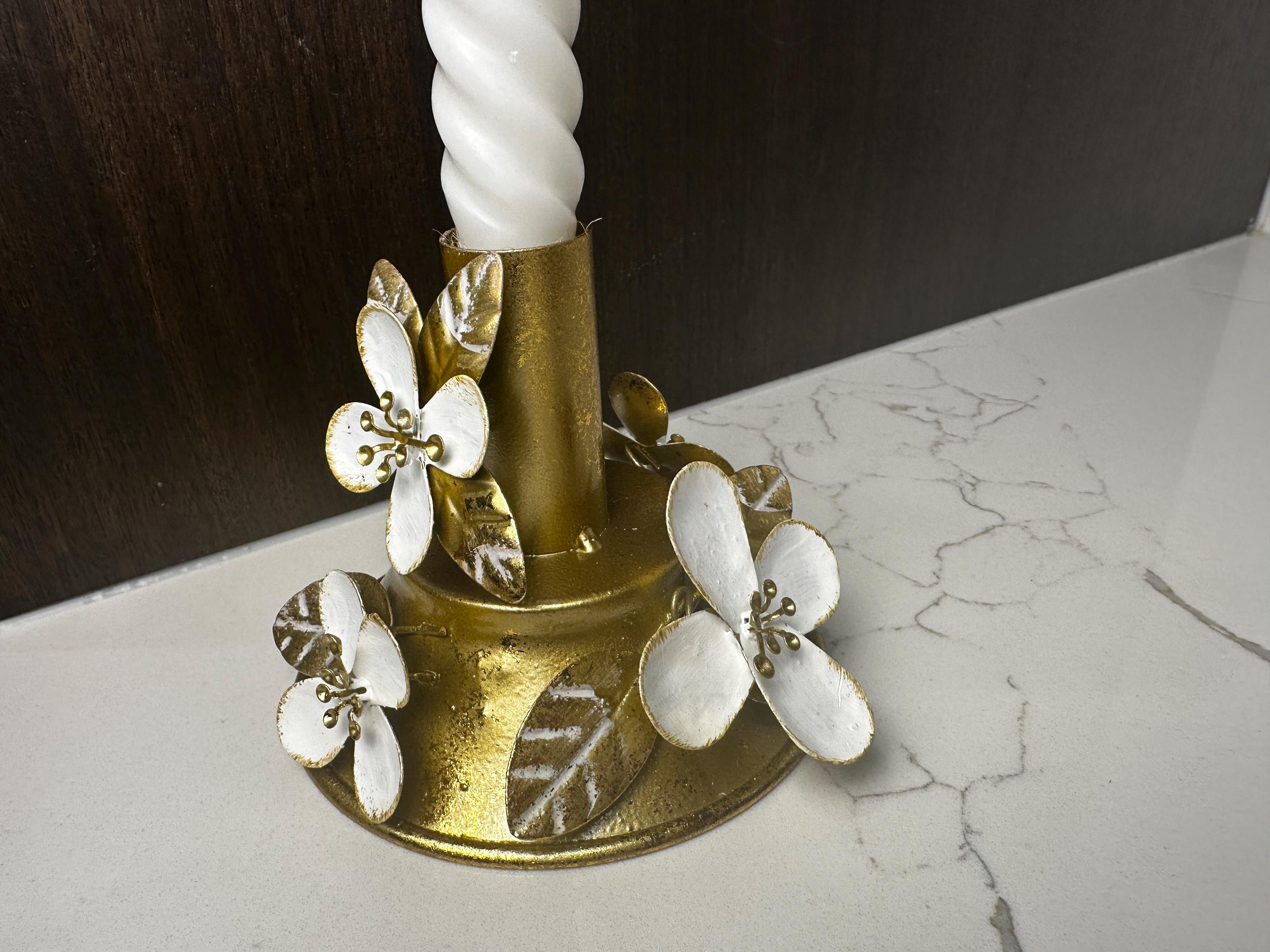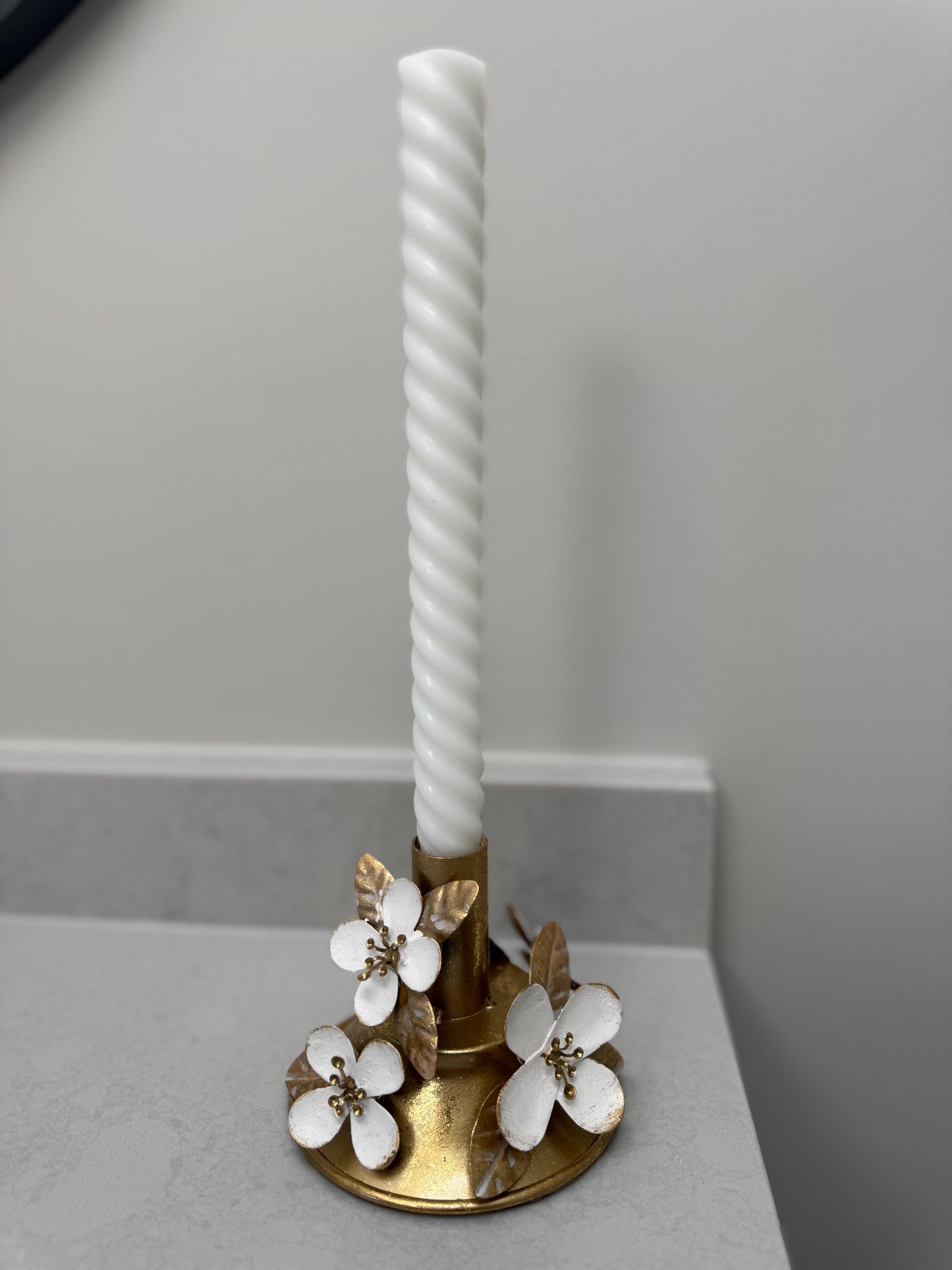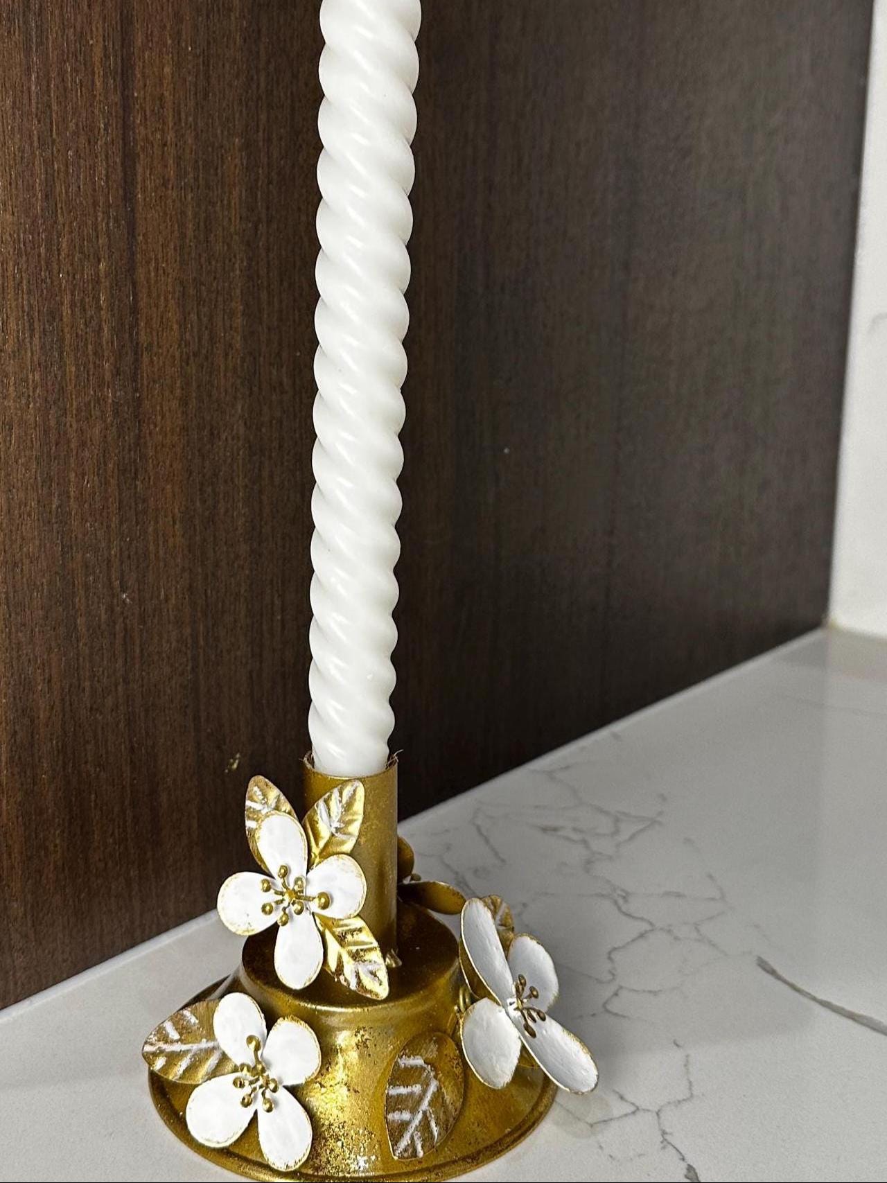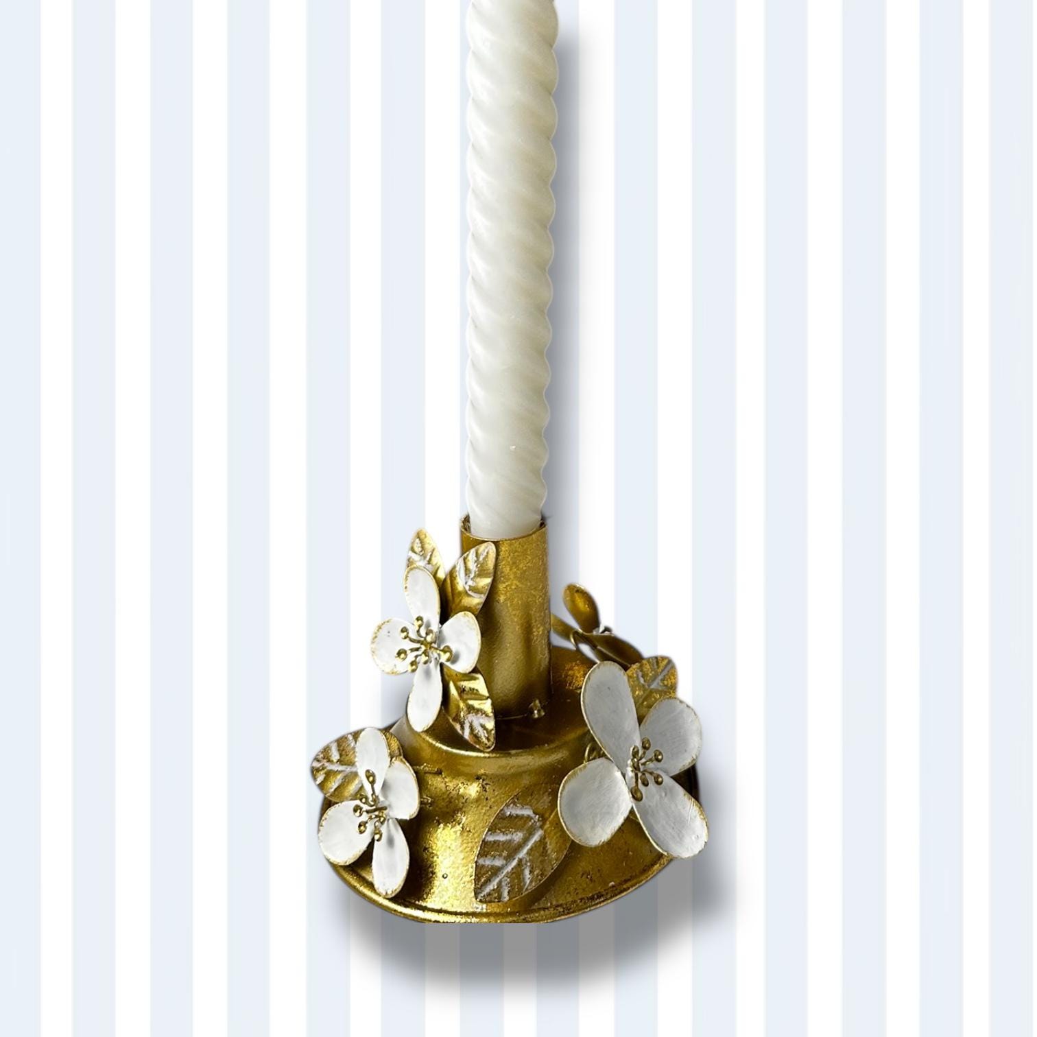 vintage-style brass candle holder with floral embellishments, featuring white enamel flowers and gold-toned leaves. The candle included is a spiral taper candle.