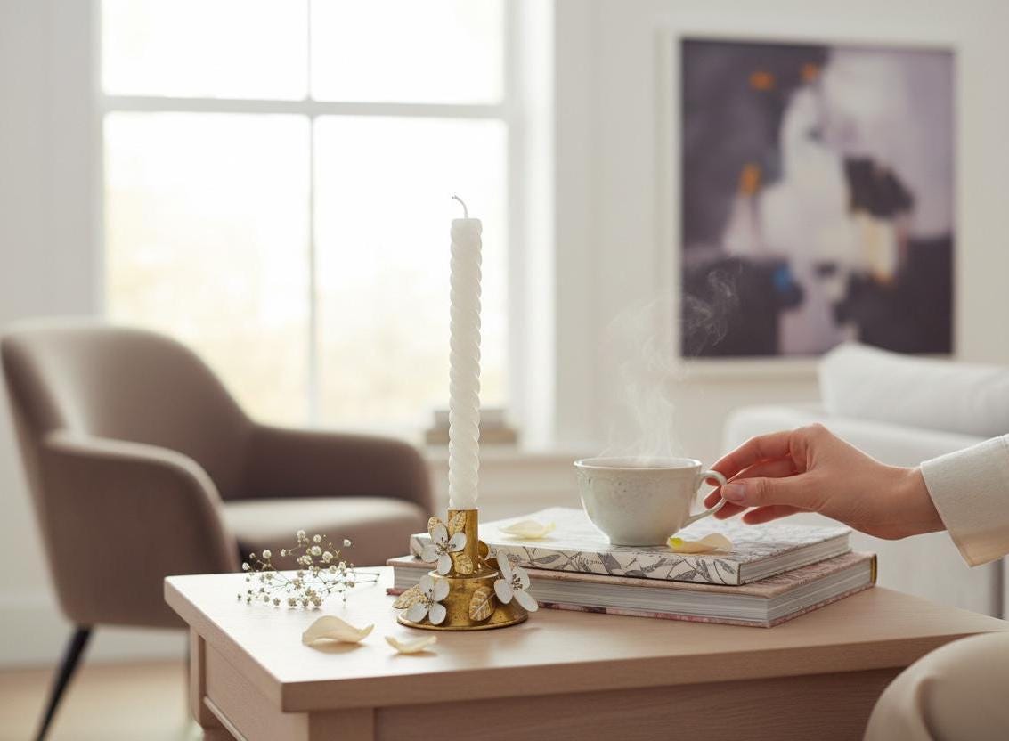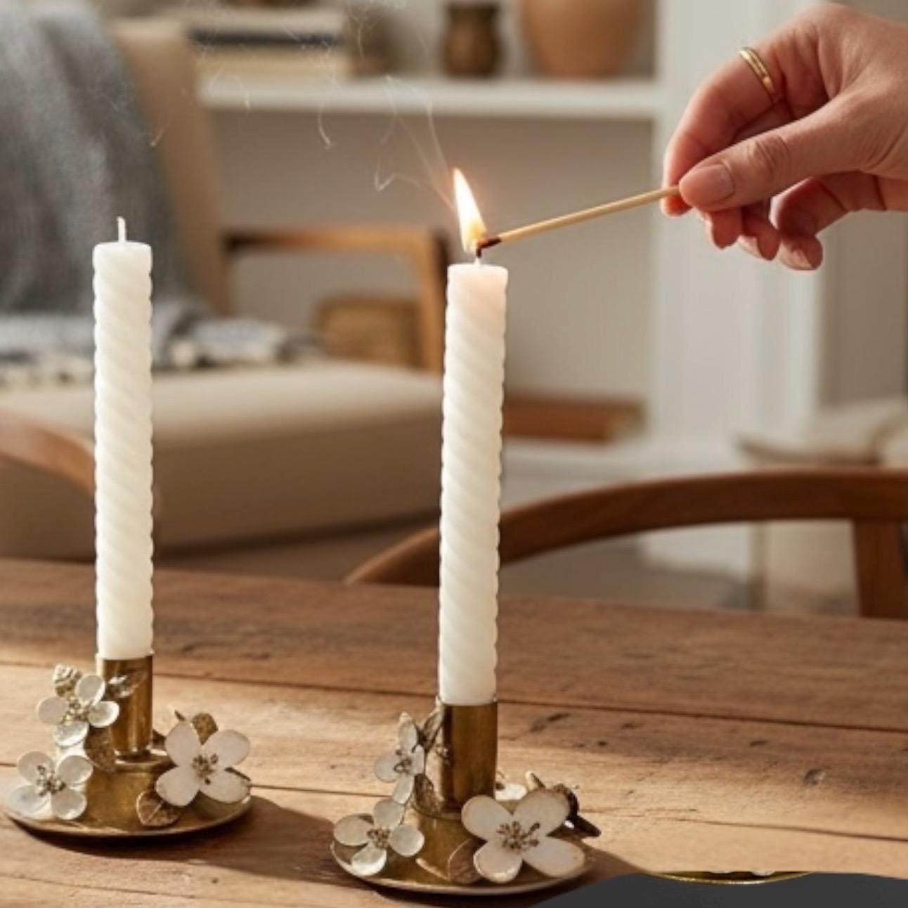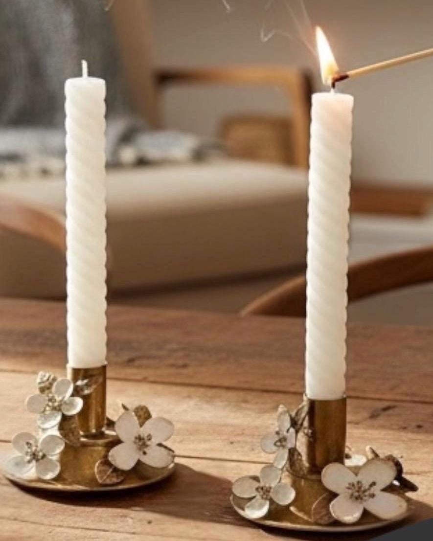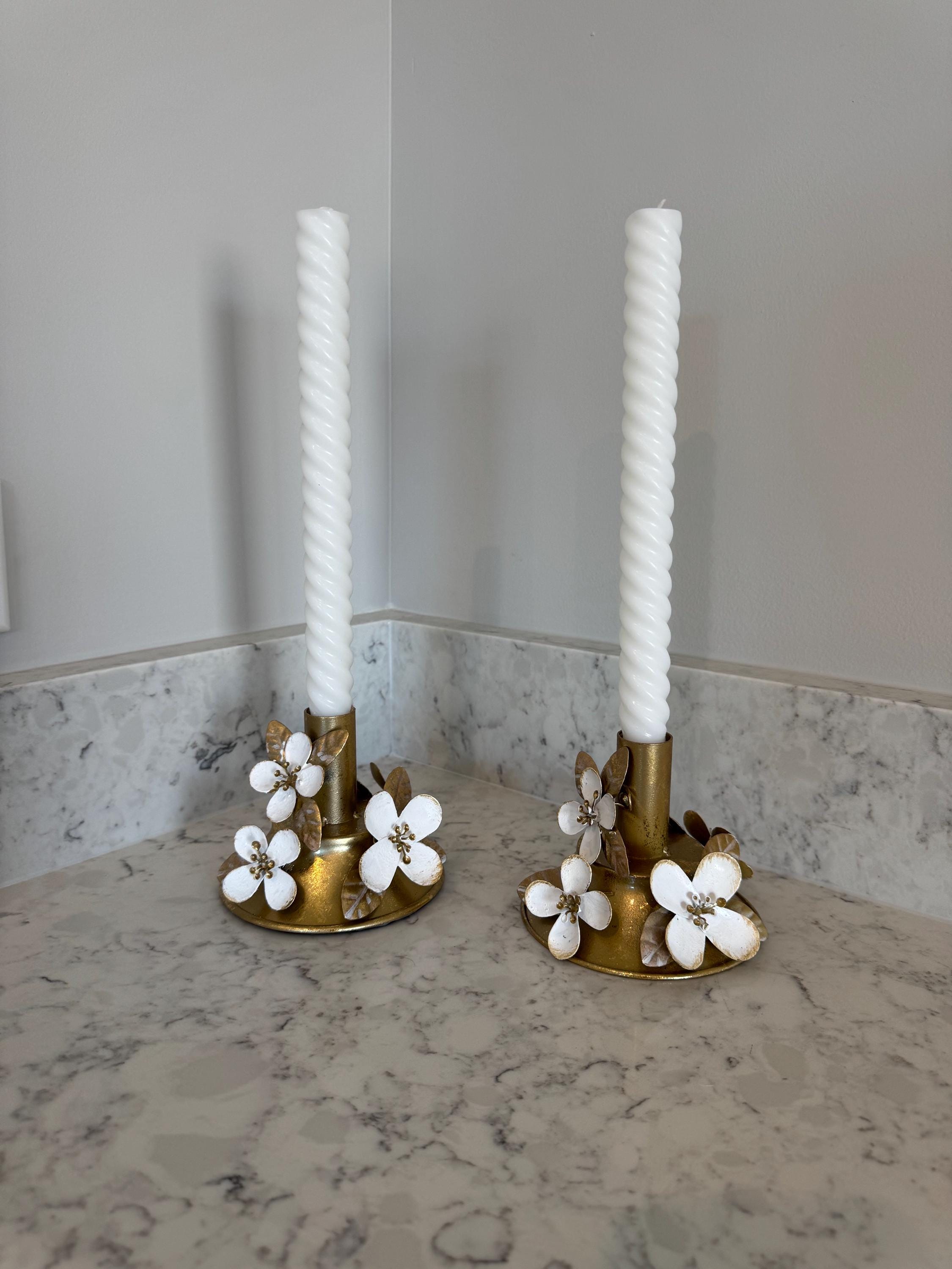 vintage-style brass candle holder with floral embellishments, featuring white enamel flowers and gold-toned leaves. The candle included is a spiral taper candle.