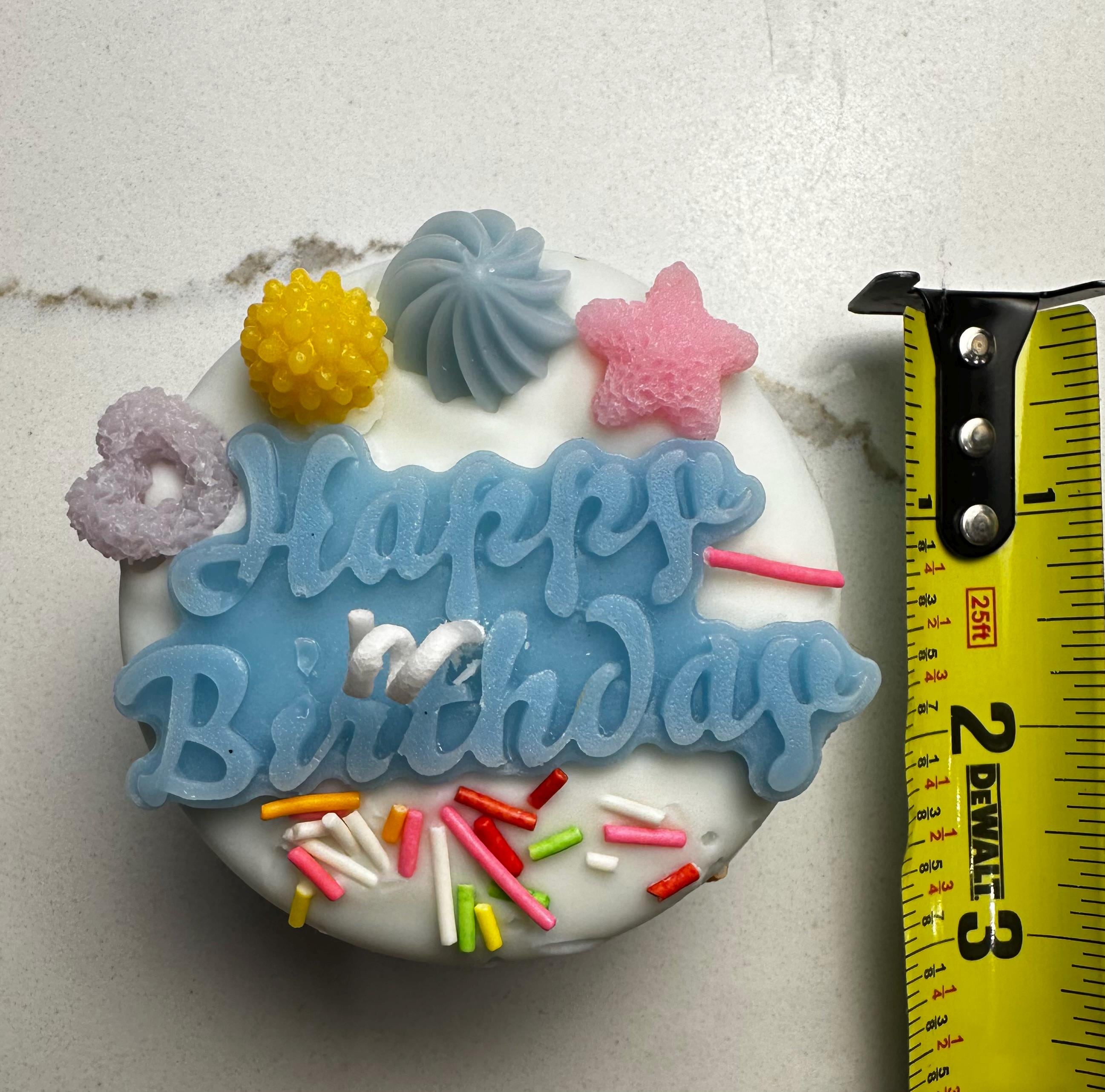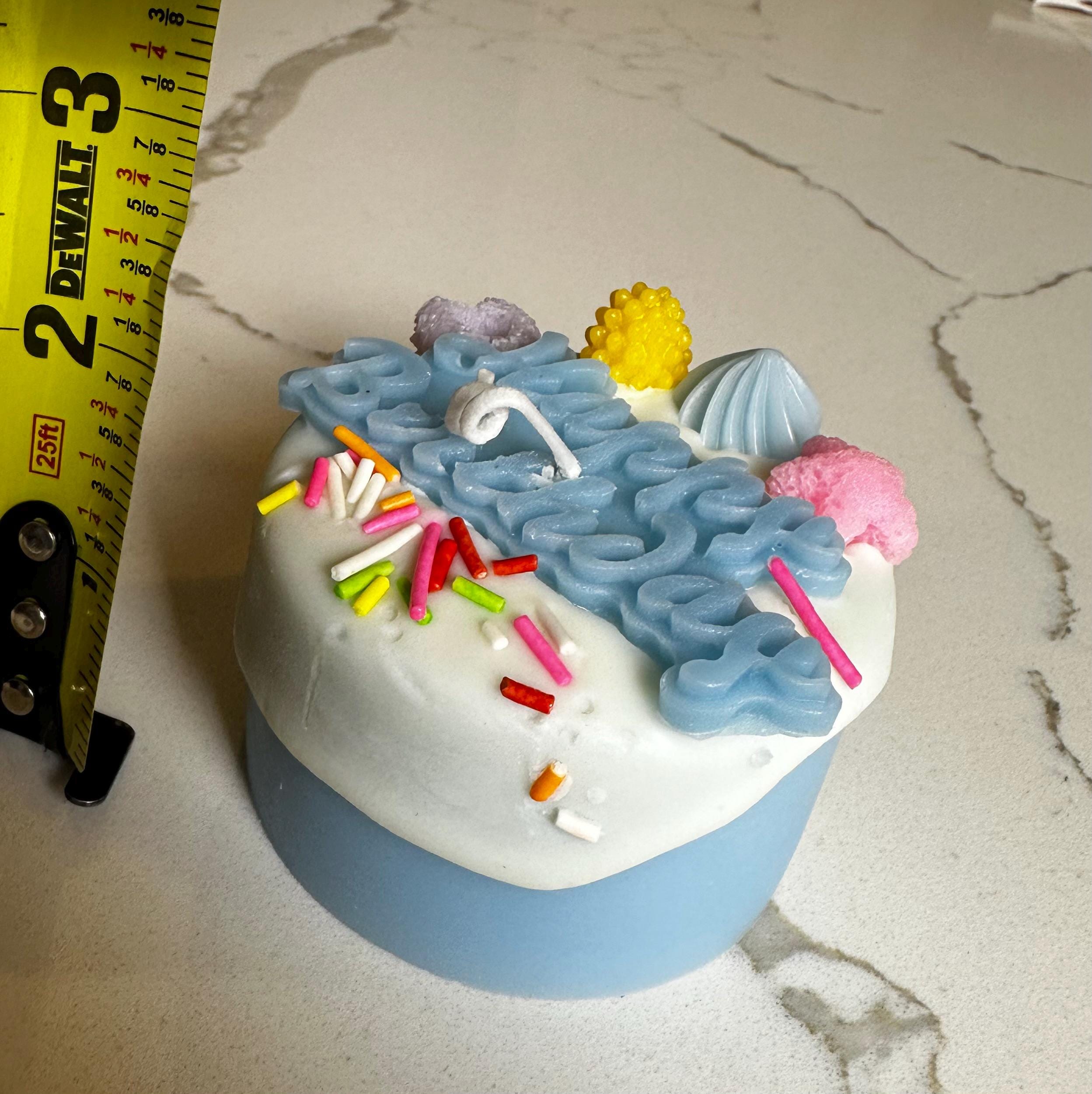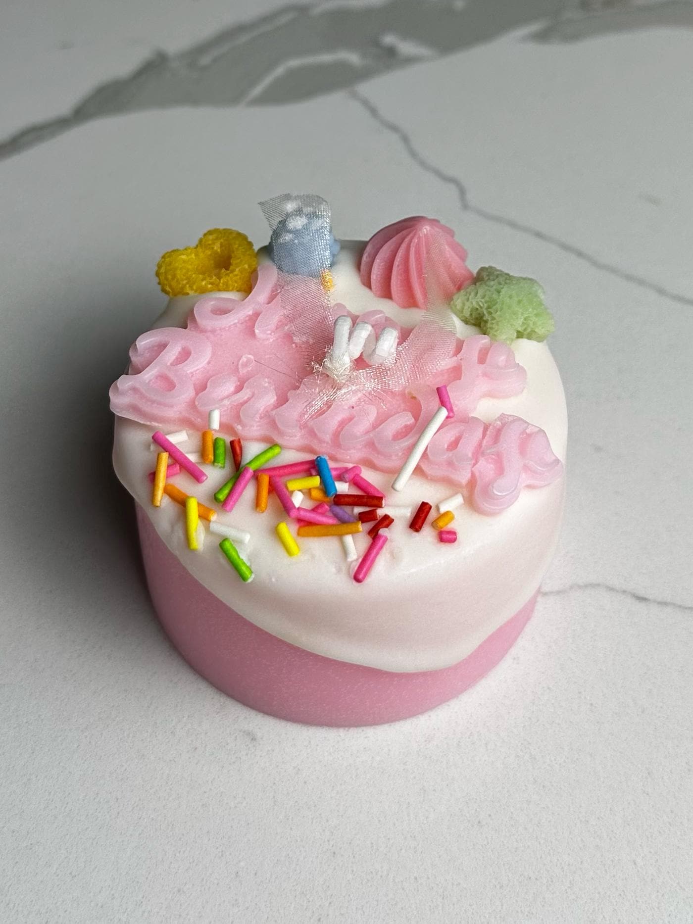 Handcrafted with love, this 2x3 inch candle is designed to look like a mini birthday cake, complete with colorful "sprinkles" and festive shapes. Perfect for birthday parties, gift baskets, or as a fun decoration for any celebration.