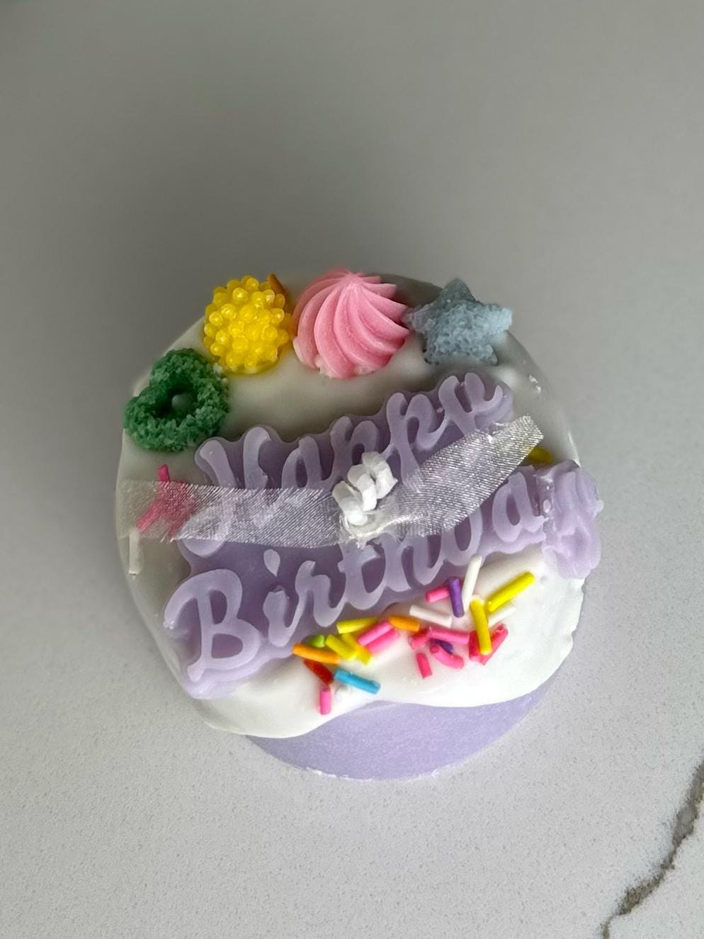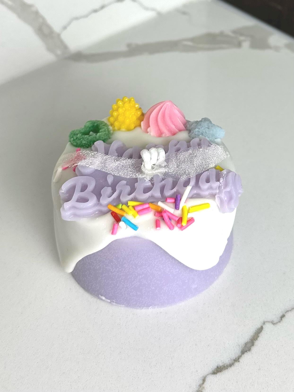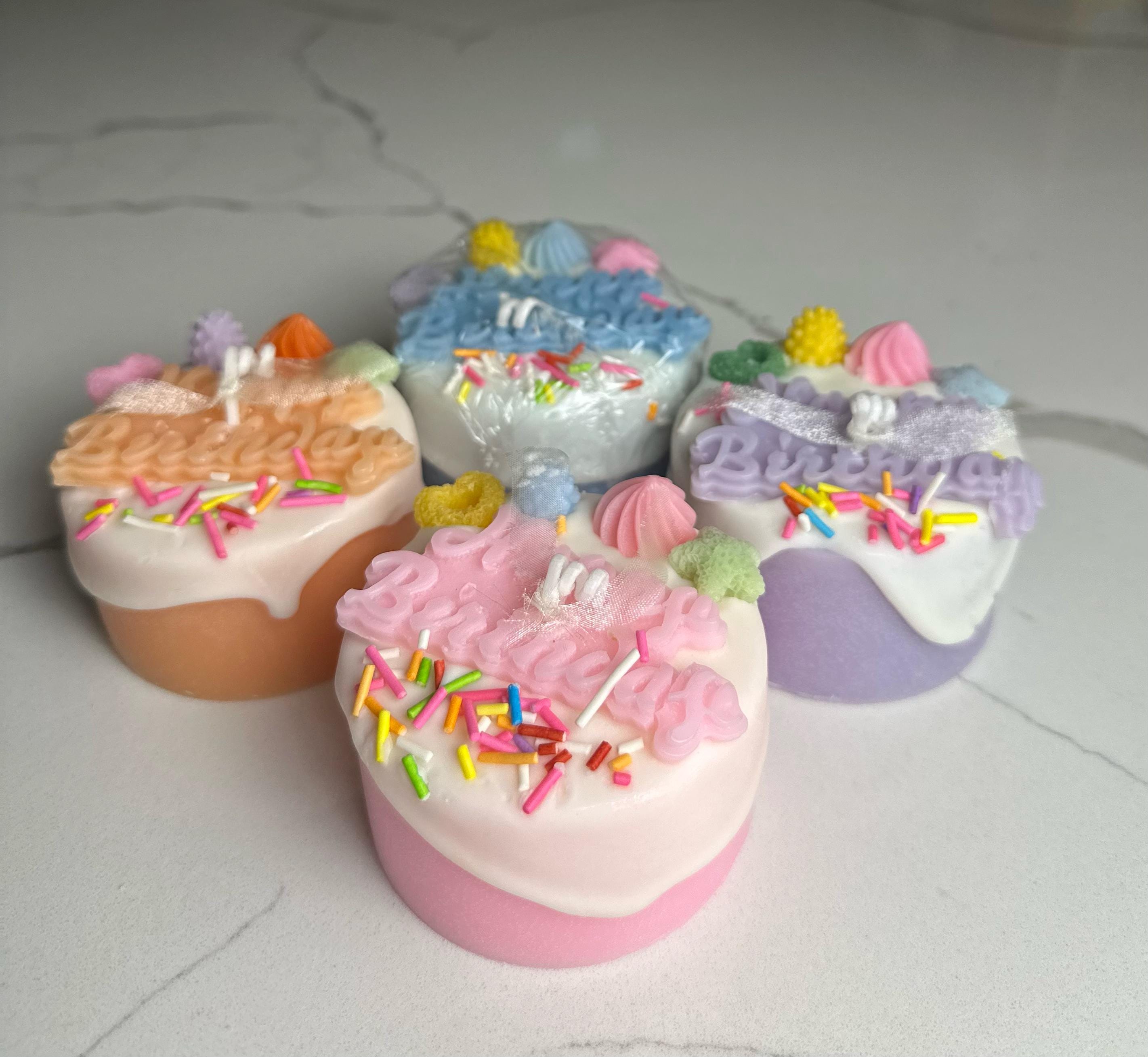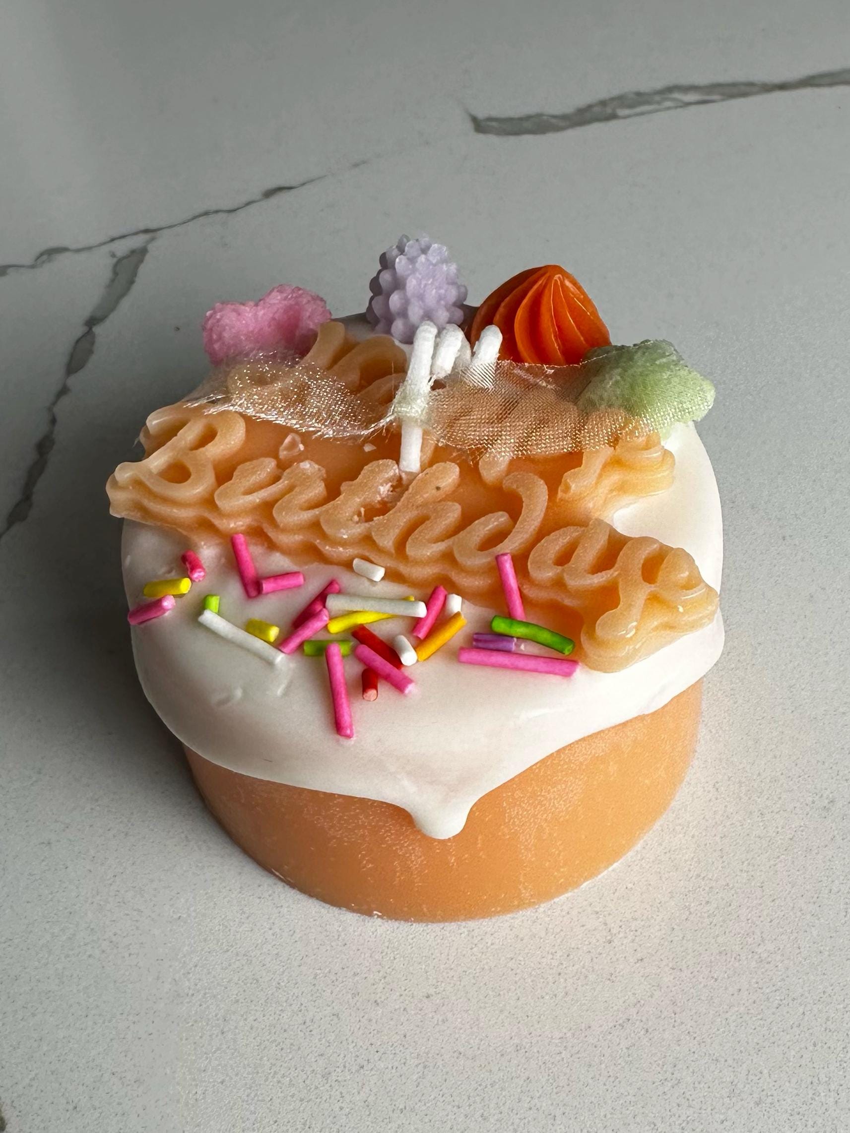 Handcrafted with love, this 2x3 inch candle is designed to look like a mini birthday cake, complete with colorful "sprinkles" and festive shapes. Perfect for birthday parties, gift baskets, or as a fun decoration for any celebration.