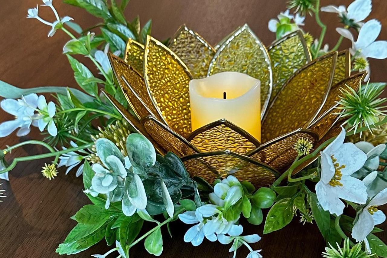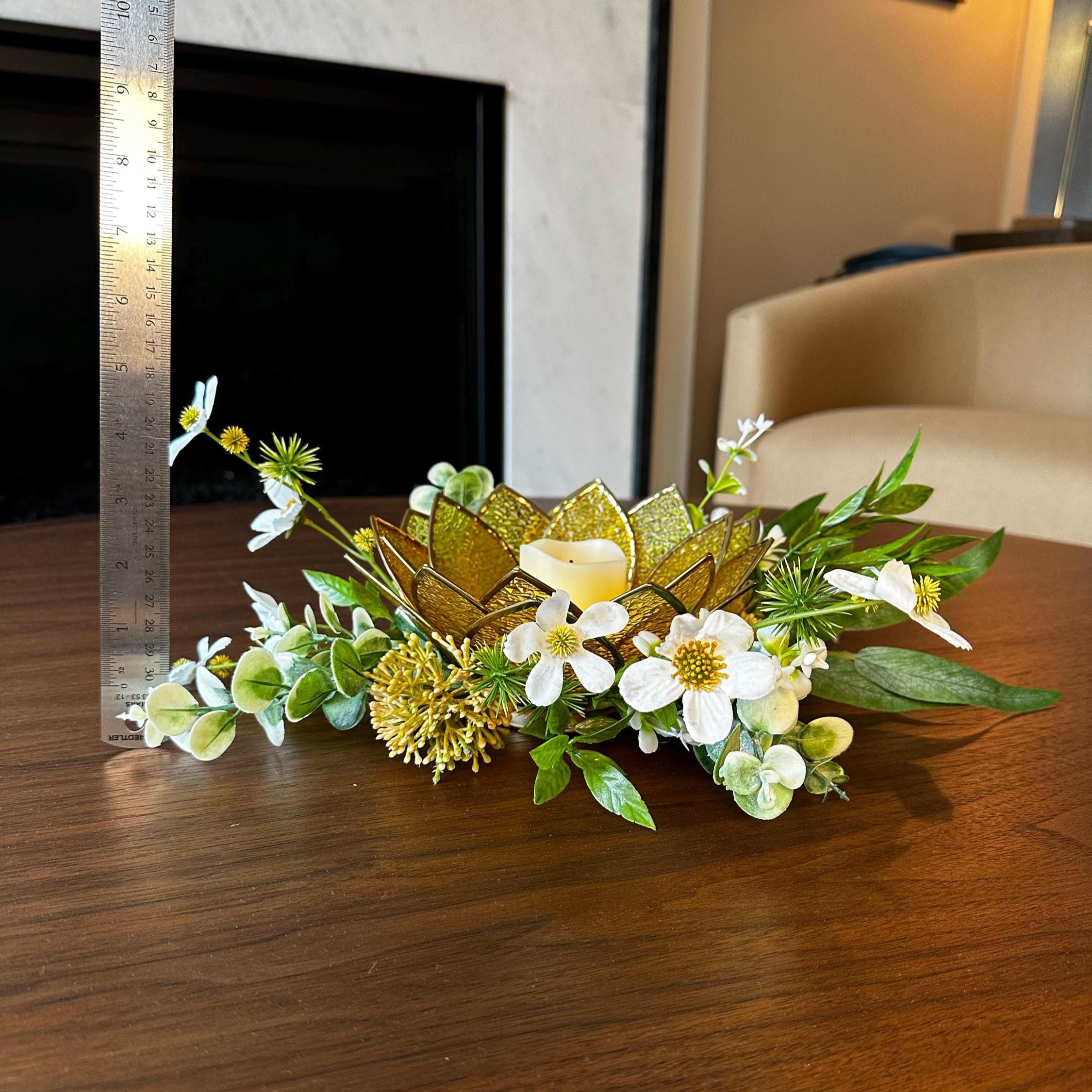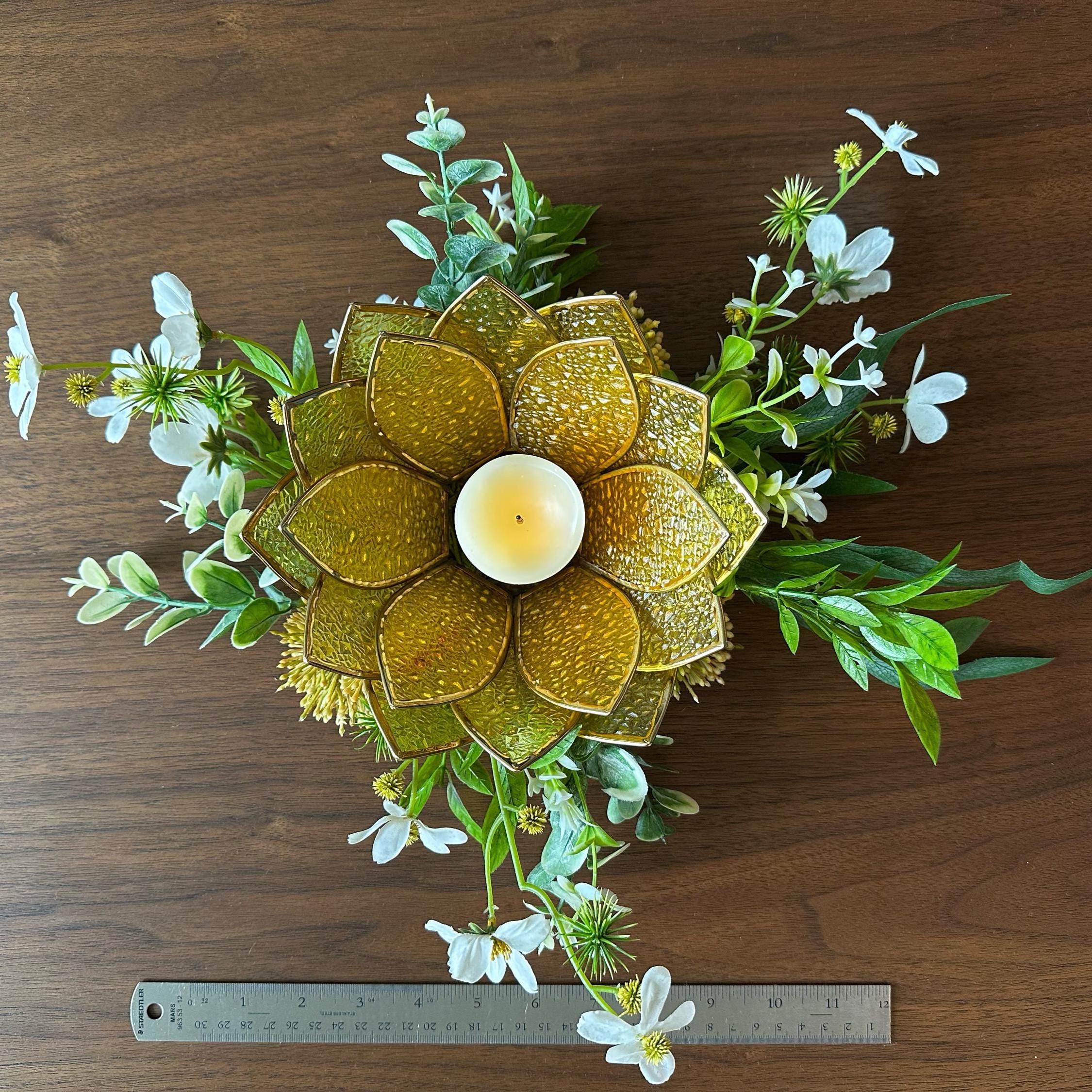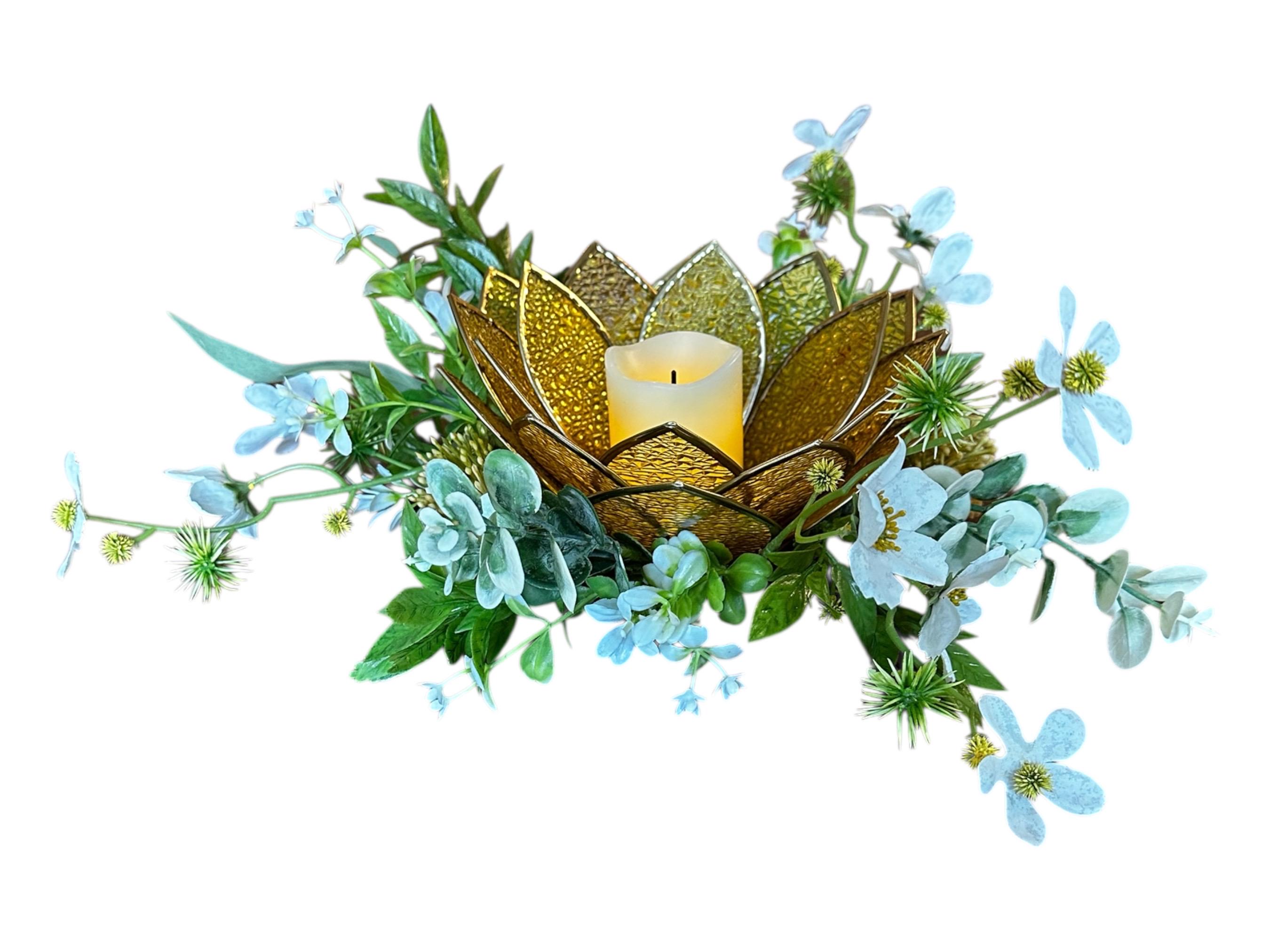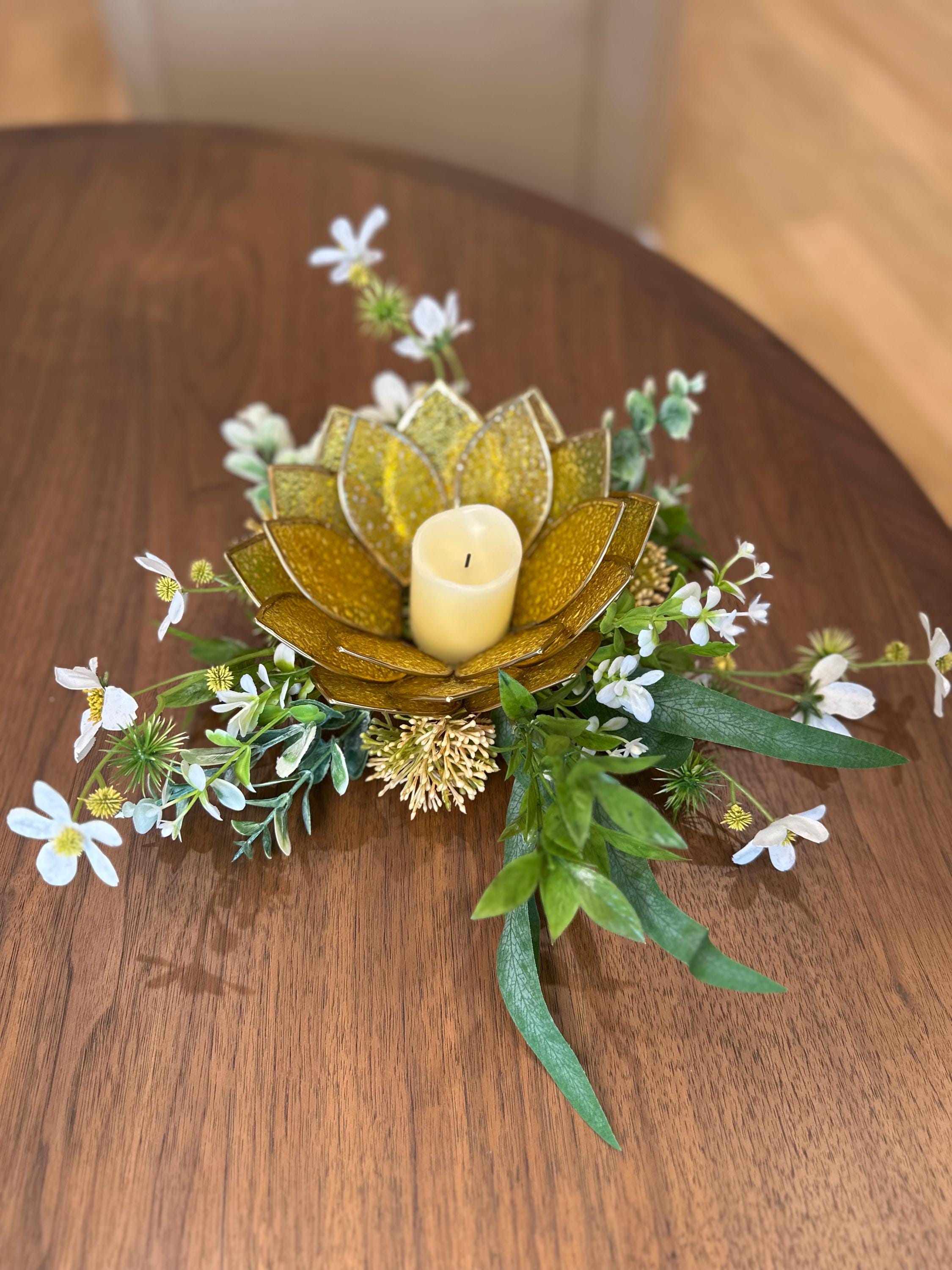 Bring warmth and elegance to your home with this fall-inspired candle centerpiece. Featuring a lotus-style candle holder in shimmering yellow tones, surrounded by white florals and lush greenery, this arrangement makes the perfect accent for your autumn décor.