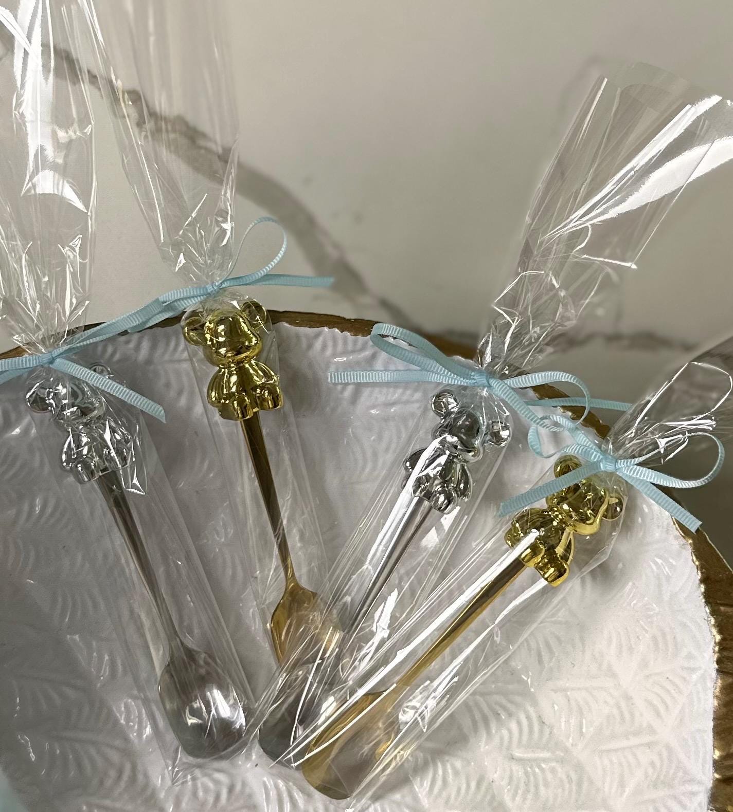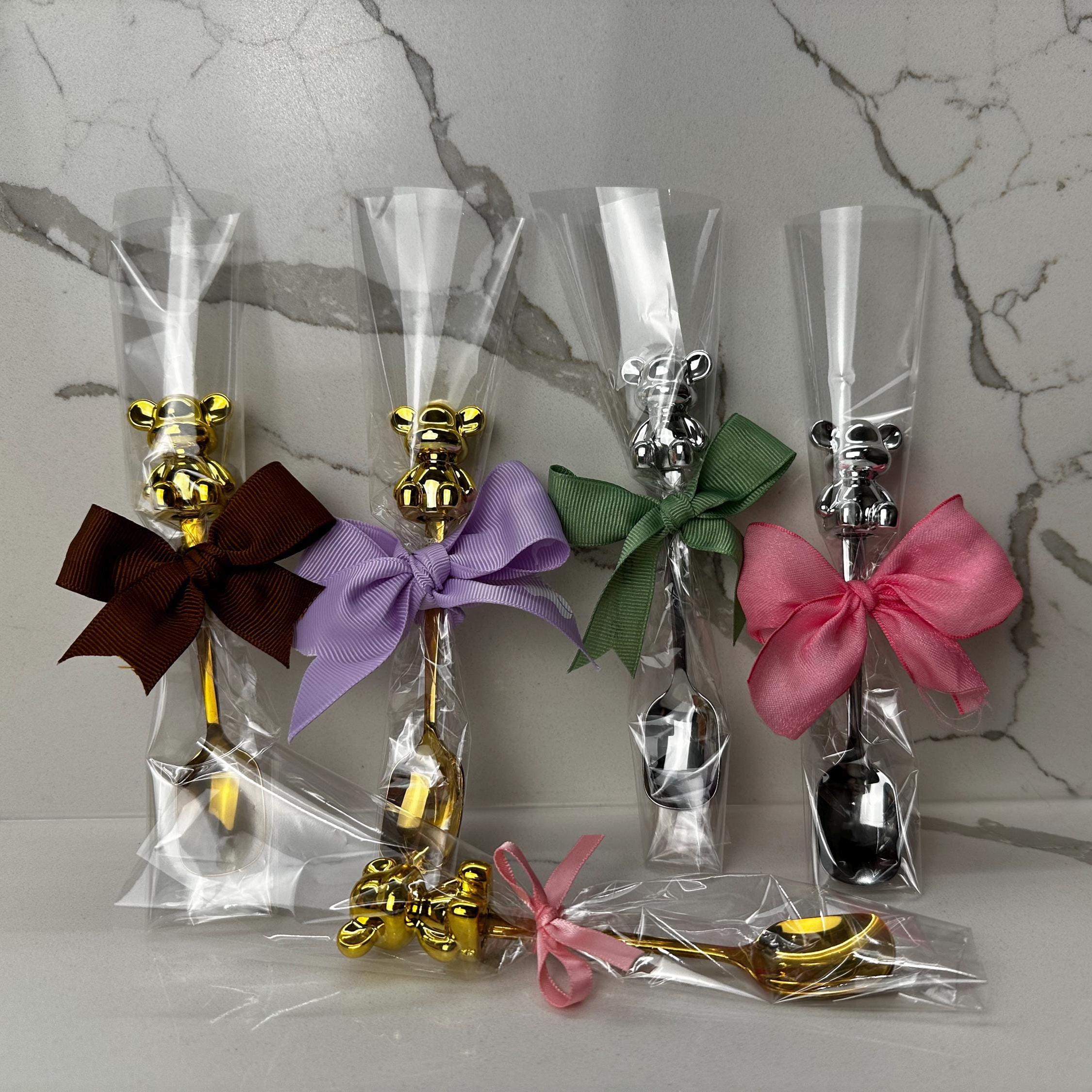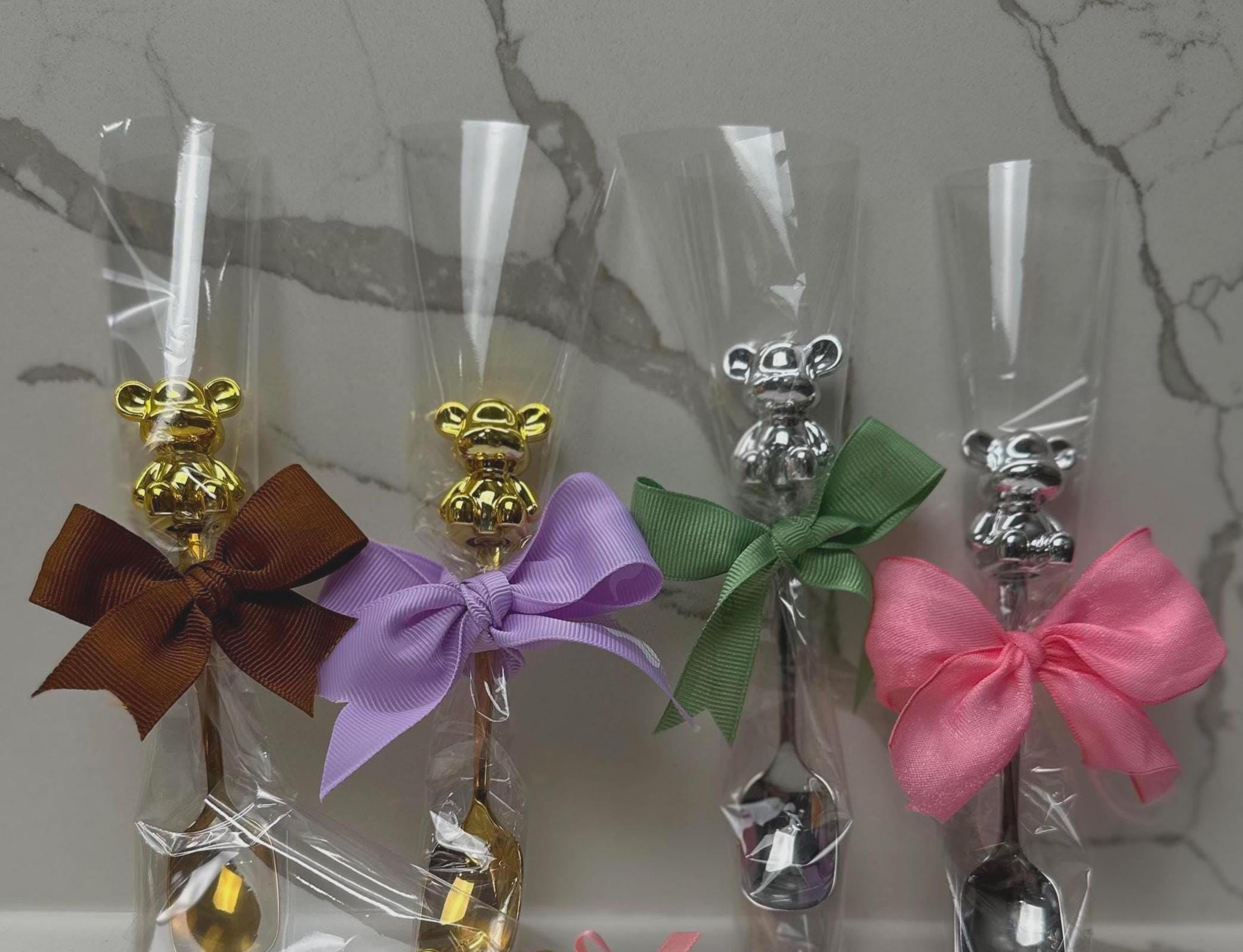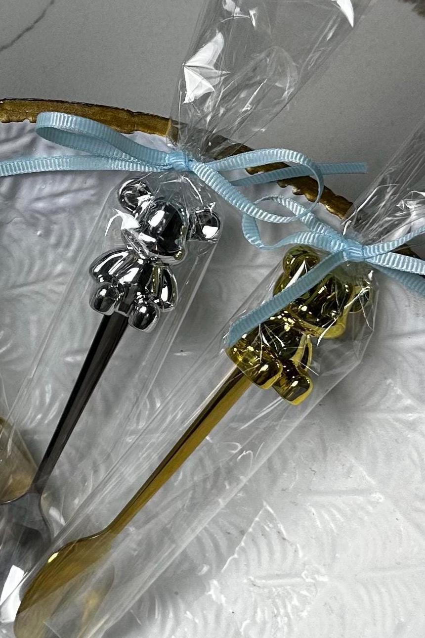 Make your baby shower or gender reveal extra special with these charming teddy bear baby spoons, beautifully wrapped and topped with custom colored bows. Each spoon features a metallic bear accent on the handle and comes individually packaged — ready to gift or place at your party table settings.