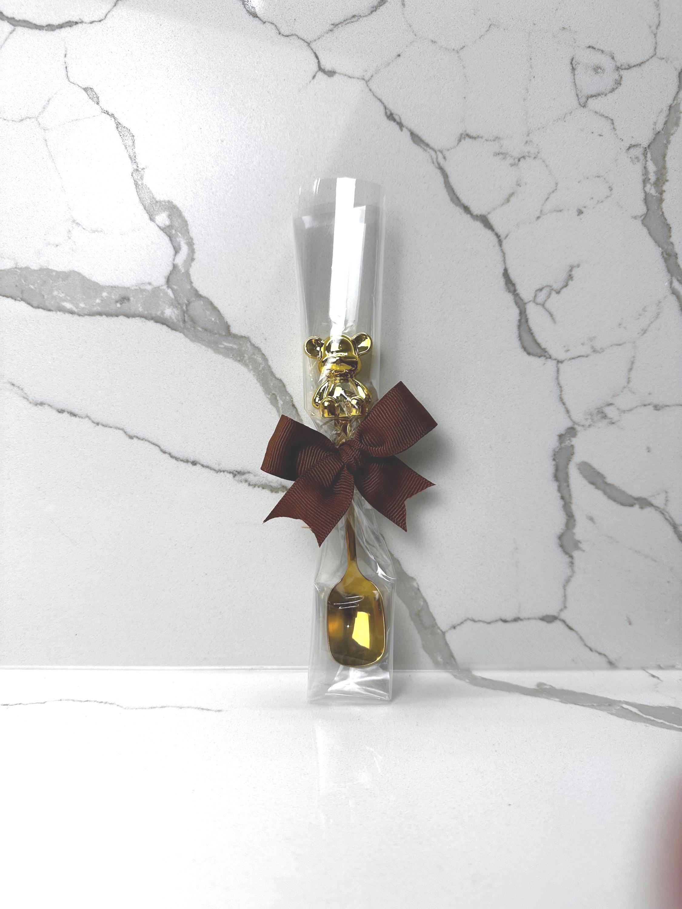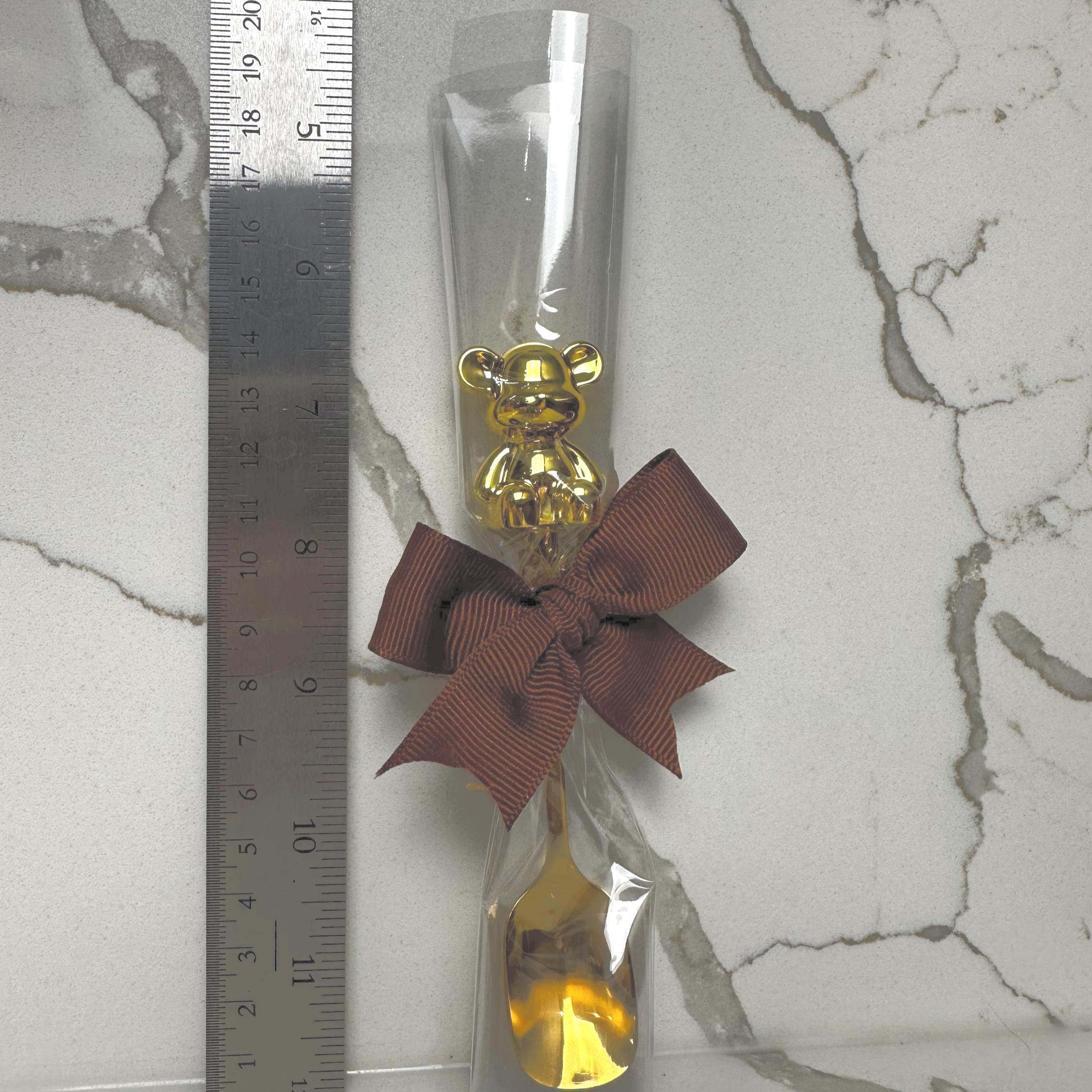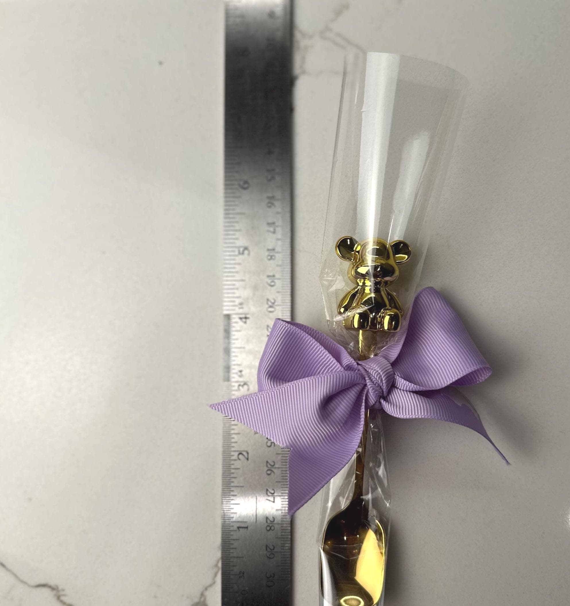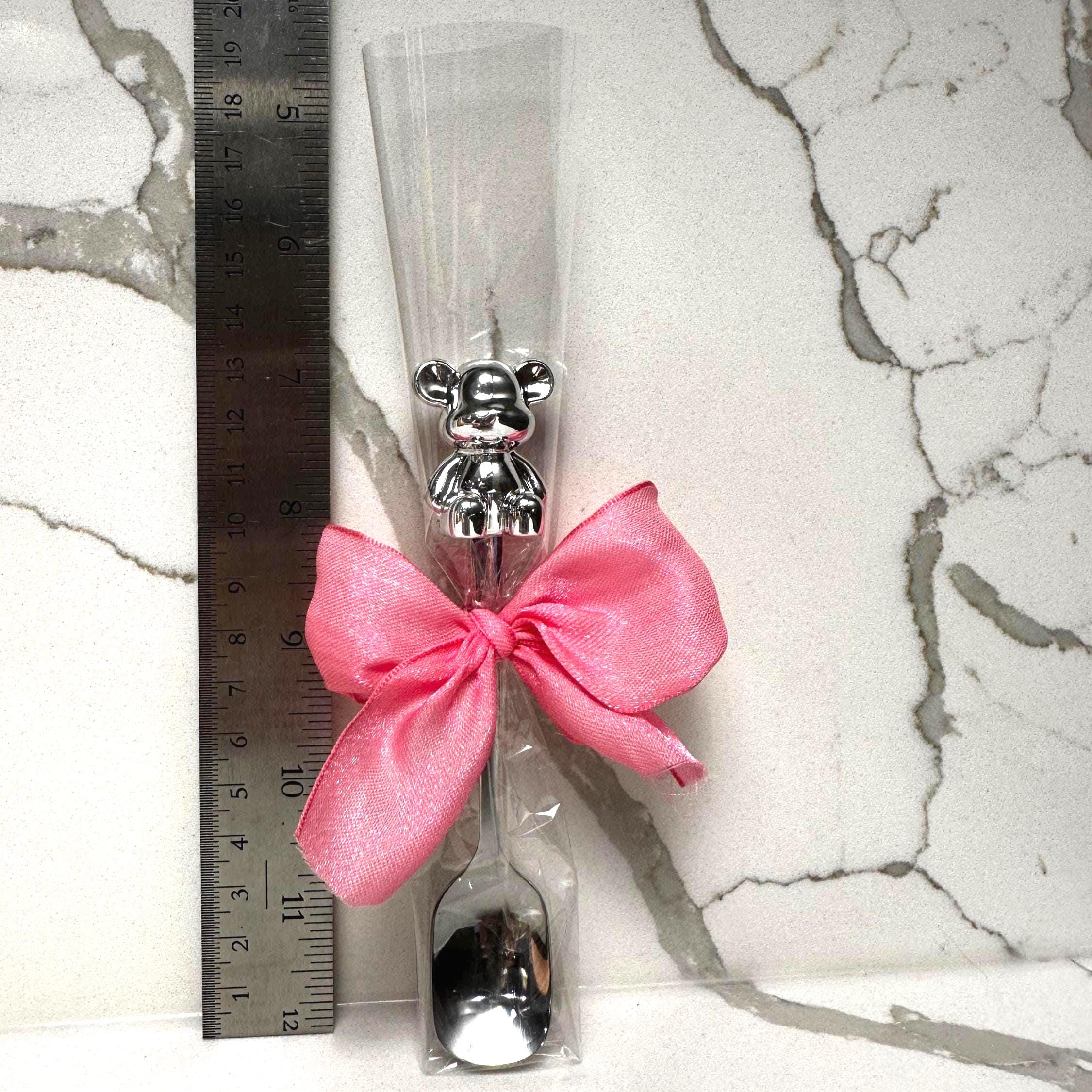 Make your baby shower or gender reveal extra special with these charming teddy bear baby spoons, beautifully wrapped and topped with custom colored bows. Each spoon features a metallic bear accent on the handle and comes individually packaged — ready to gift or place at your party table settings.