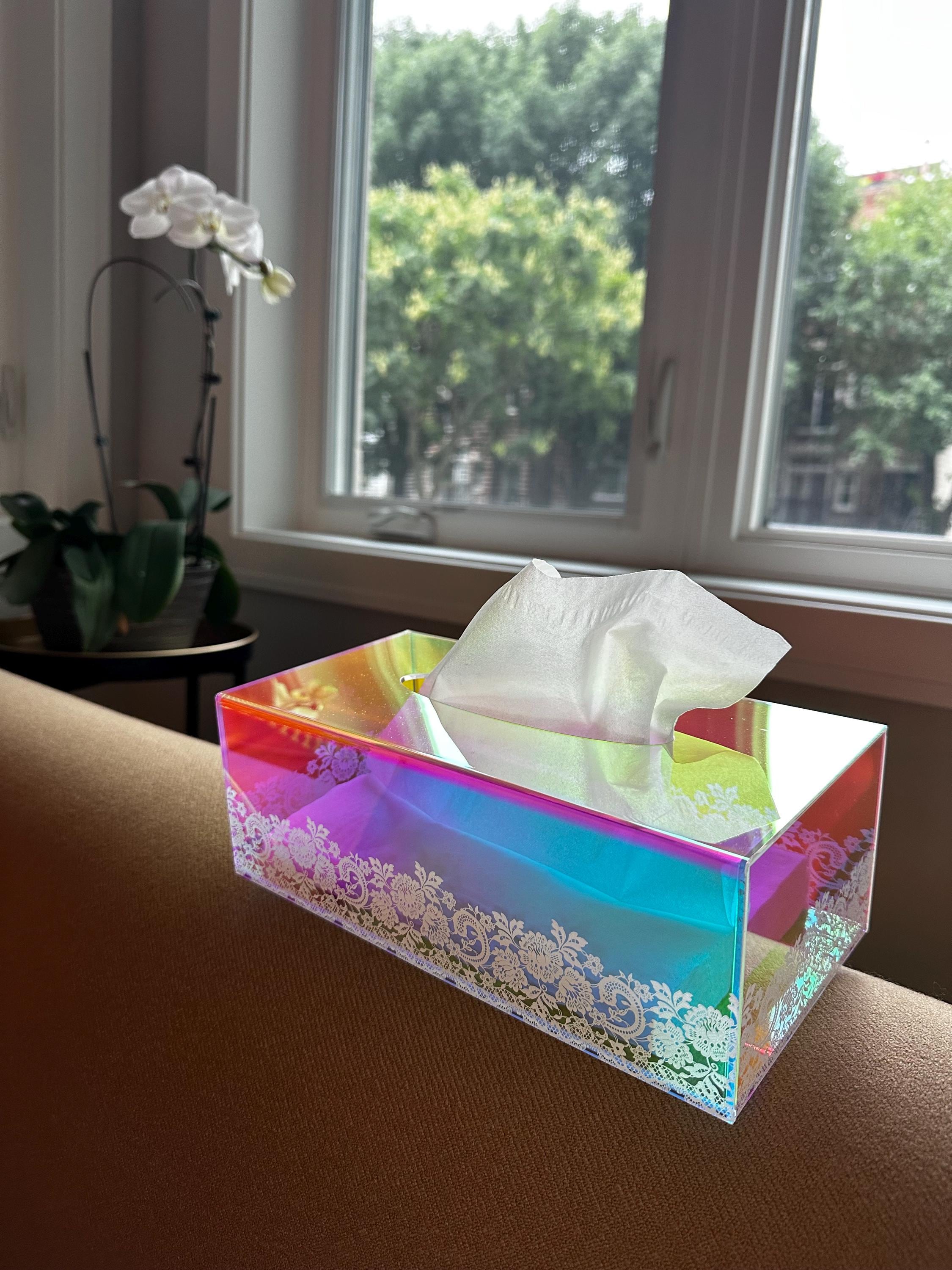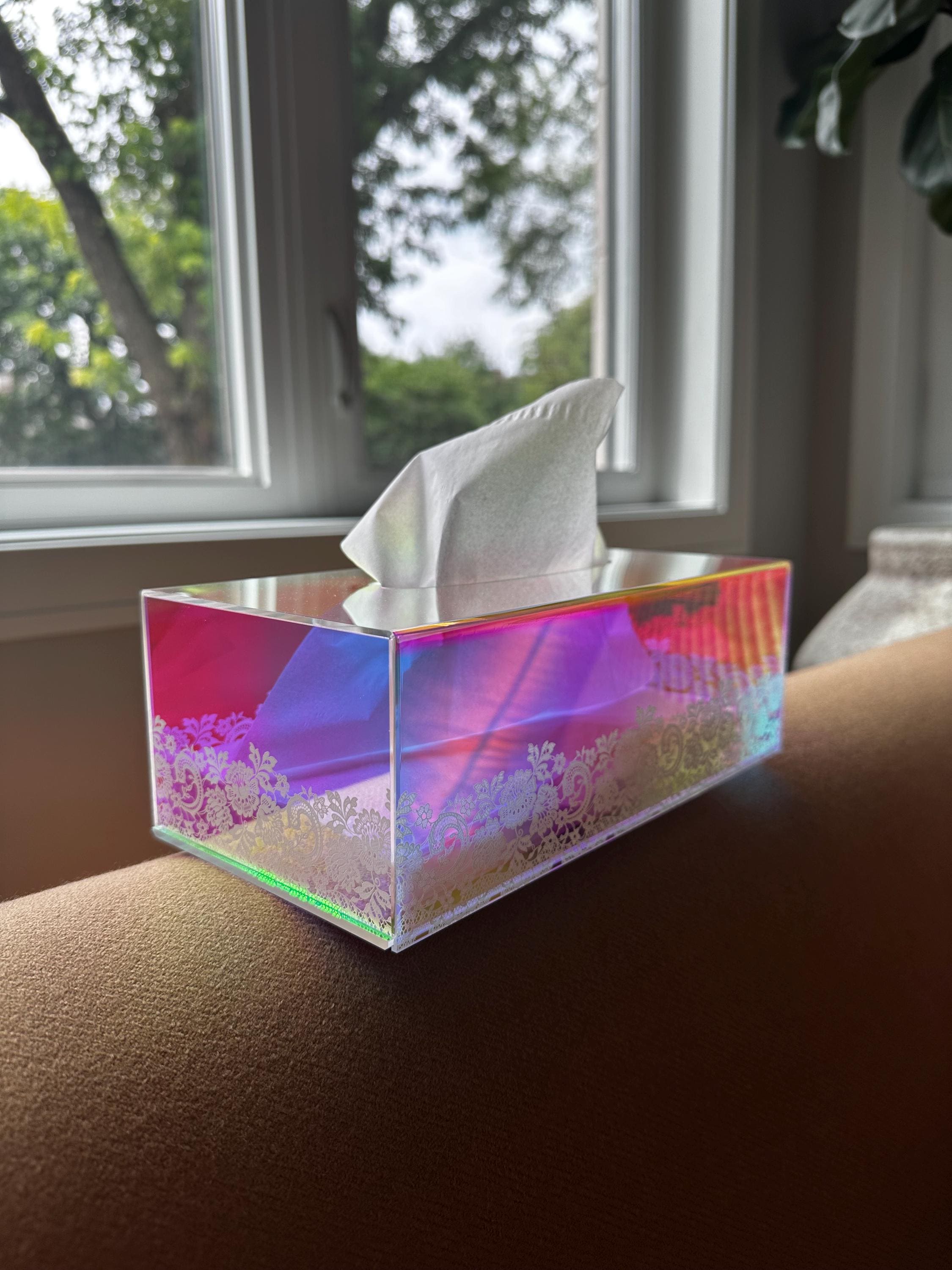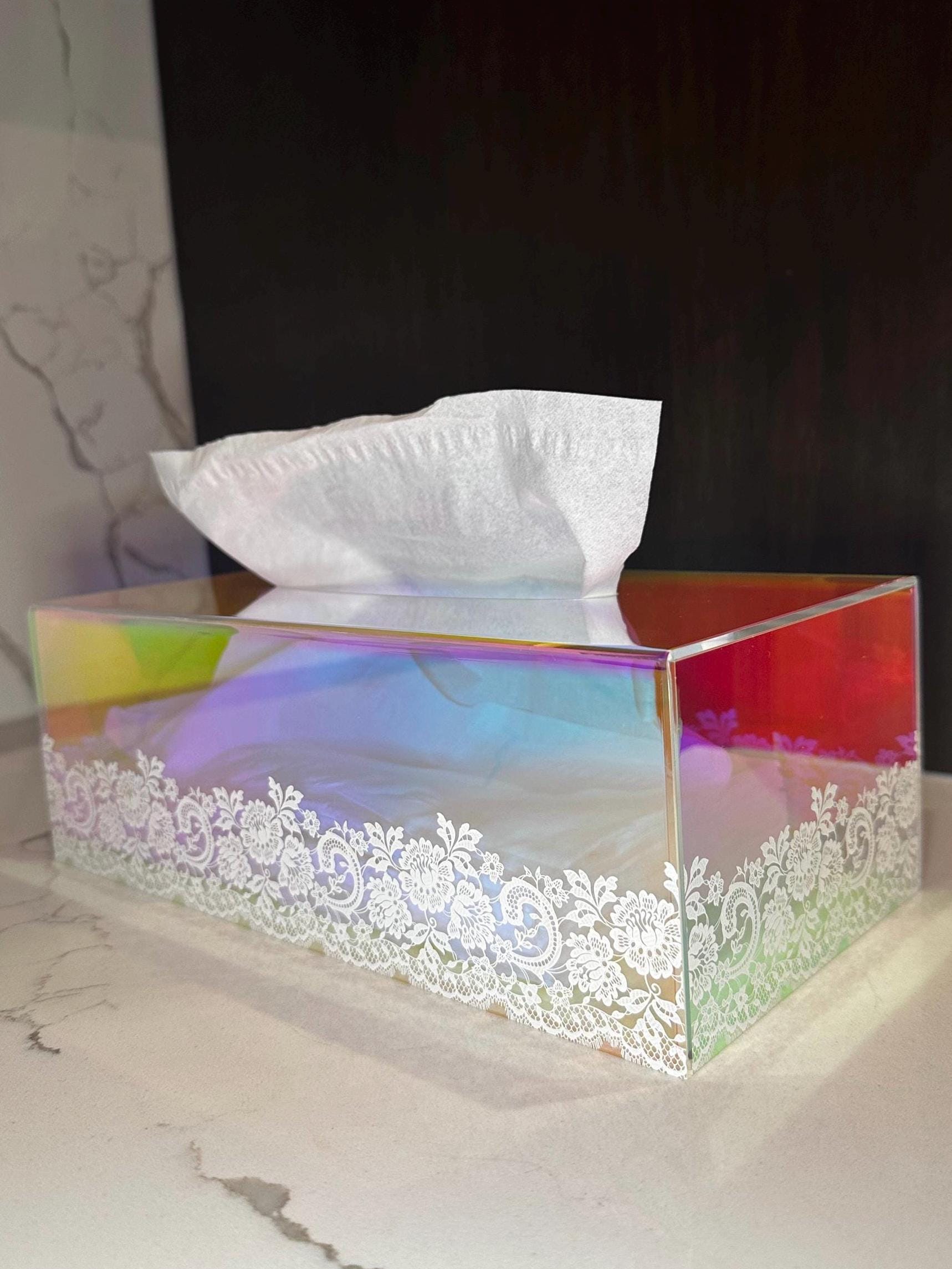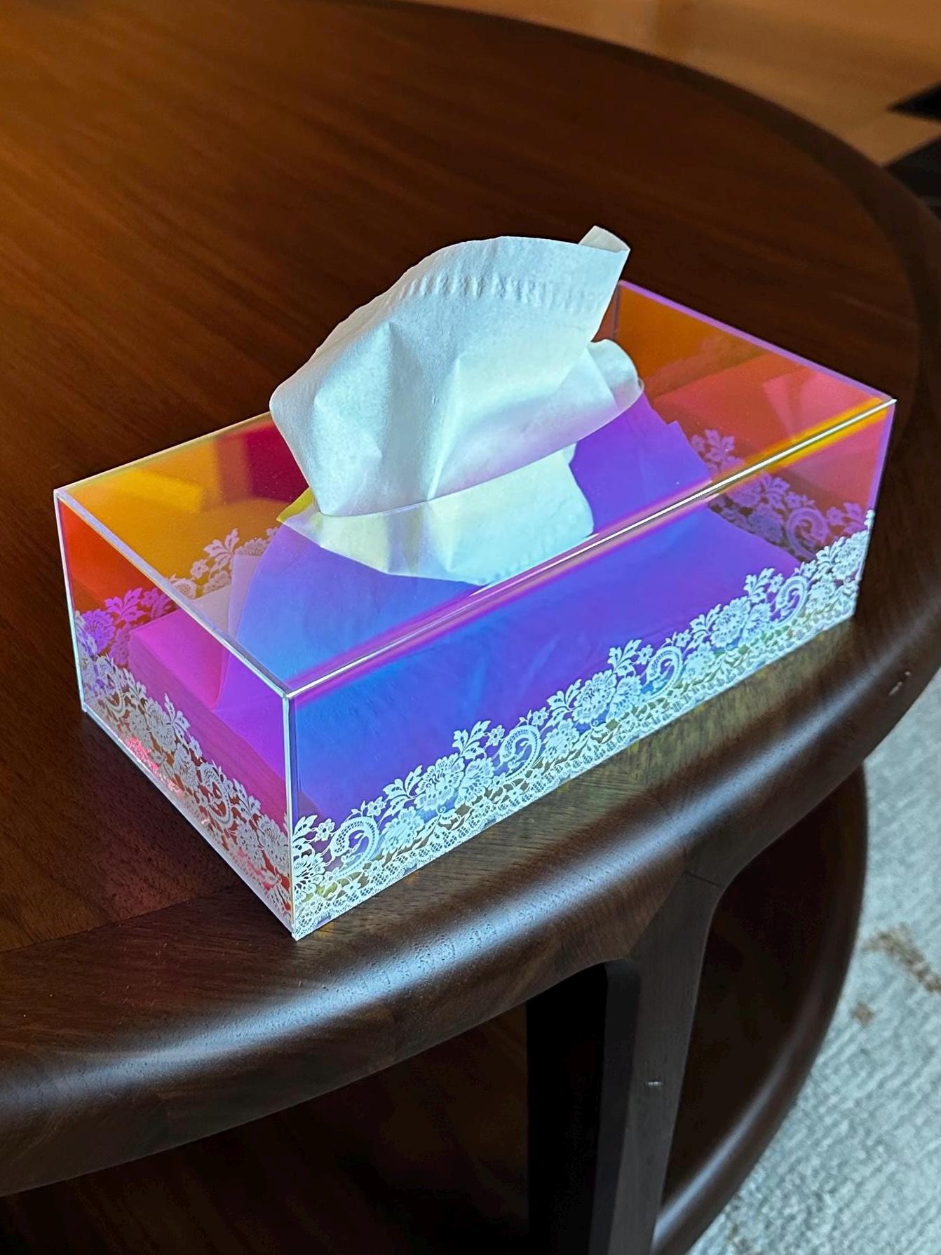 Iridescent Acrylic Tissue Box Cover – Decorative Lace-Patterned Holder for Standard Tissue Boxes – Modern Home Decor