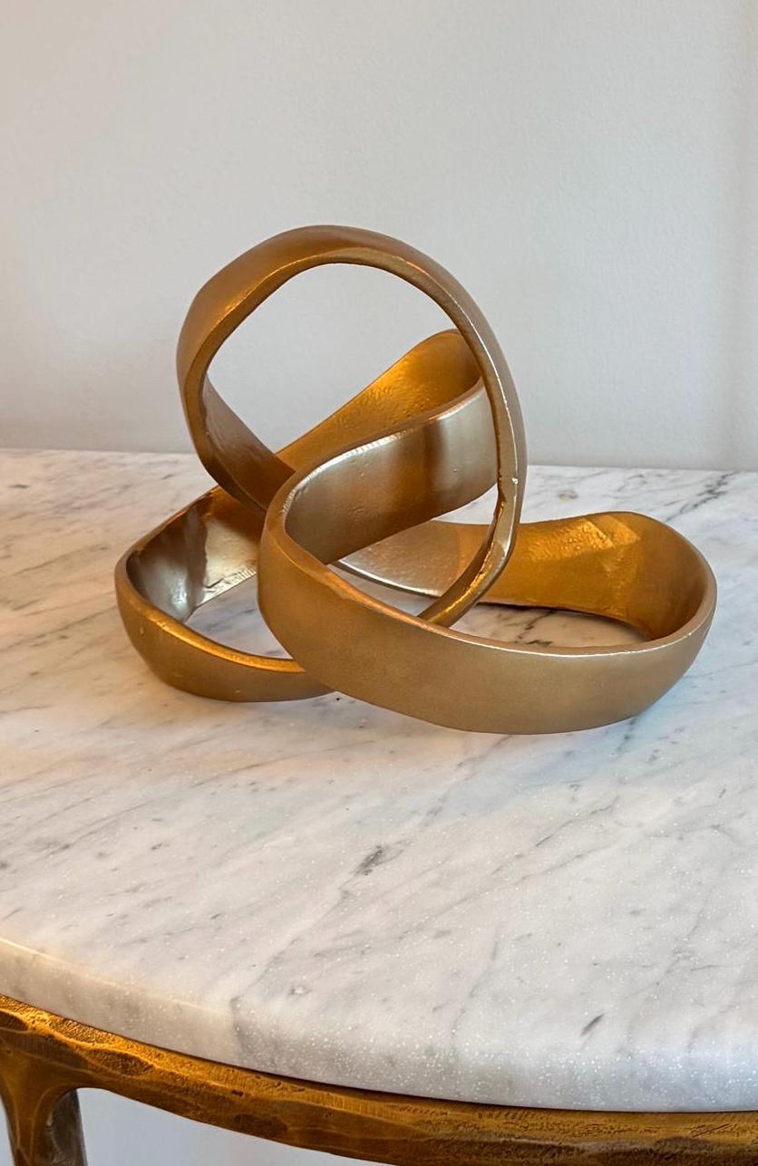 Add a sculptural statement to your space with this modern abstract gold accent. Crafted from a continuous ribbon of metal that twists and loops into an elegant interlocking form, this piece creates a striking balance between movement and simplicity. The warm matte gold finish reflects light beautifully, making it a sophisticated addition to coffee tables, shelves, consoles, or office desks.