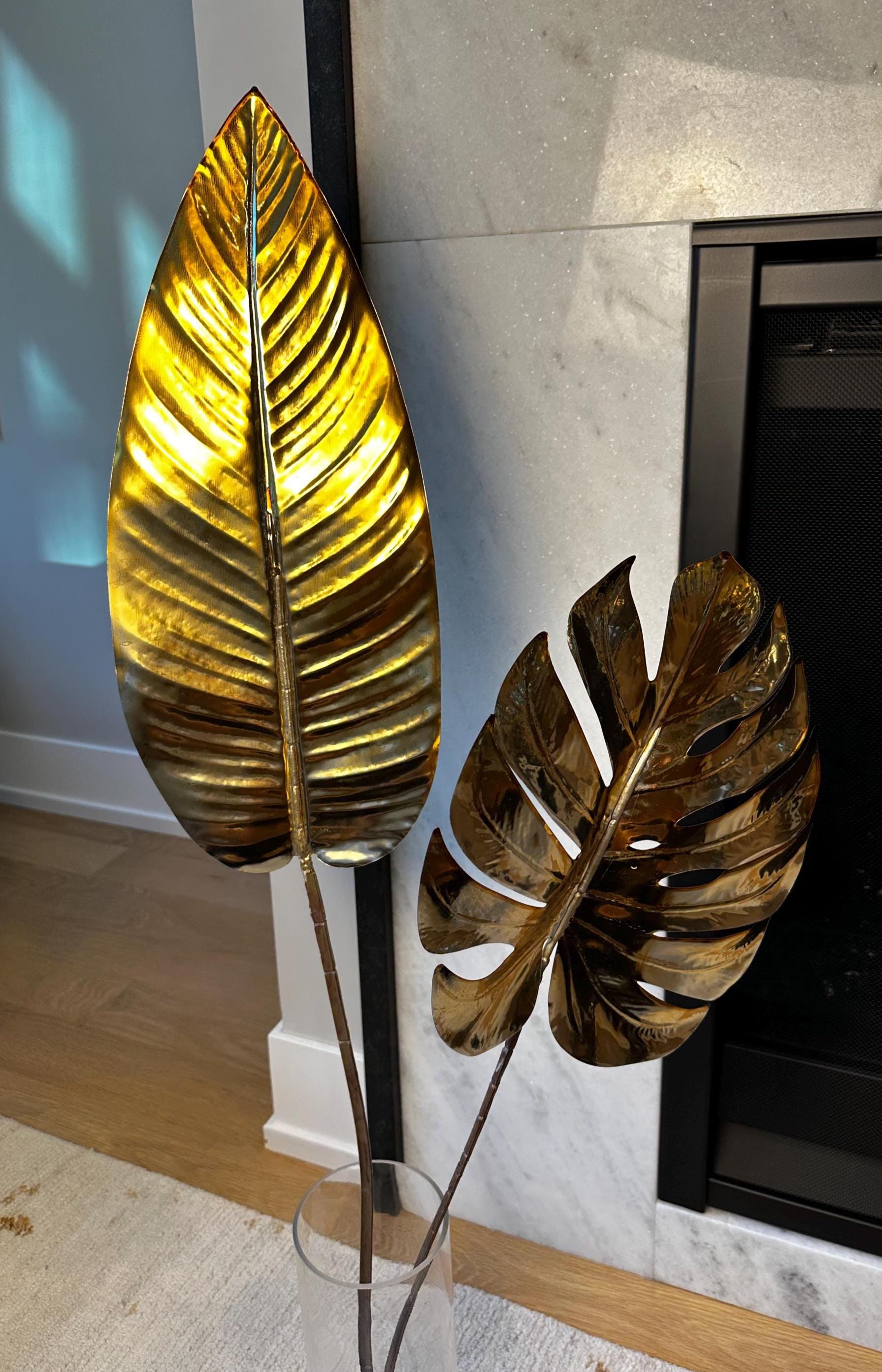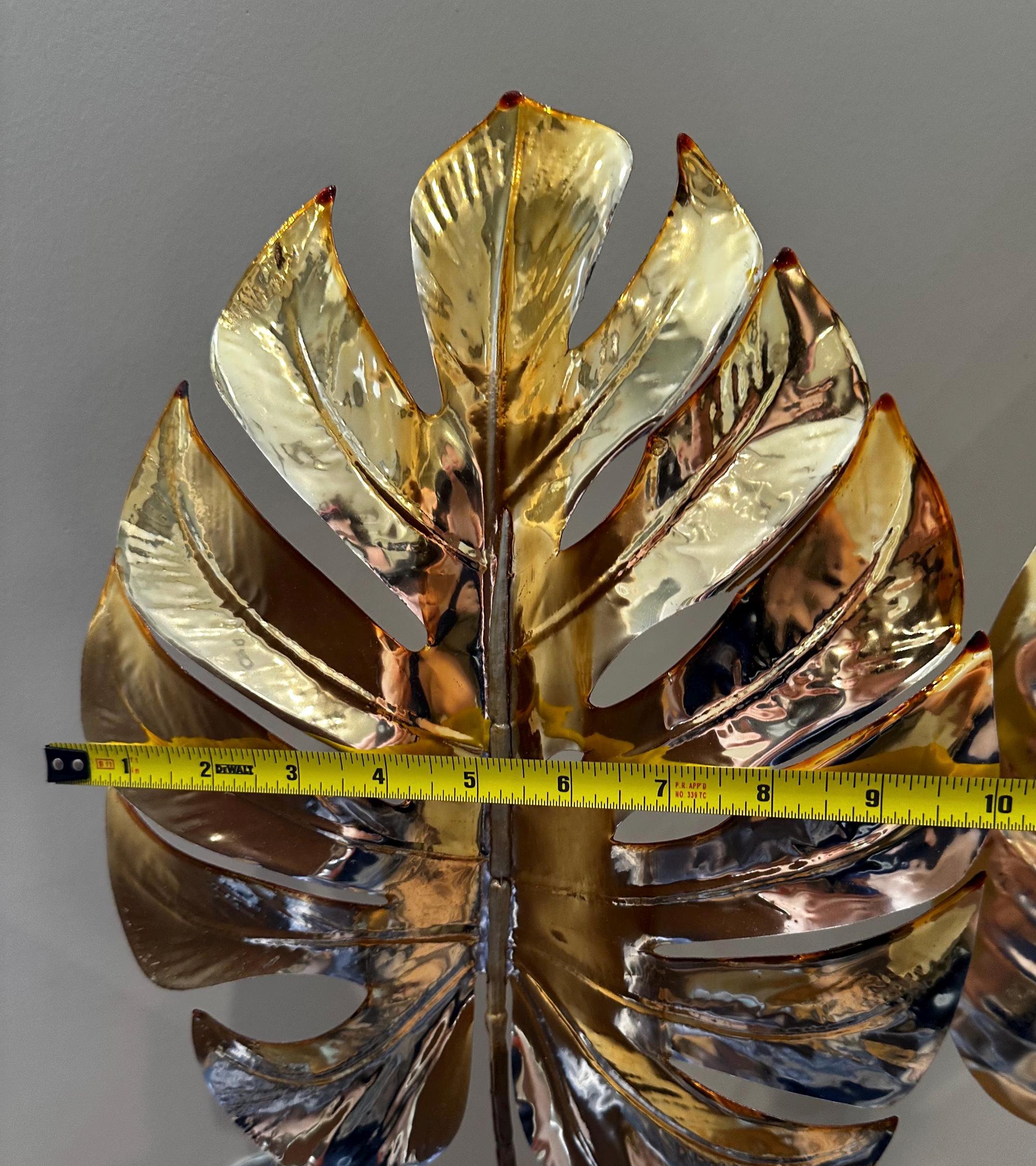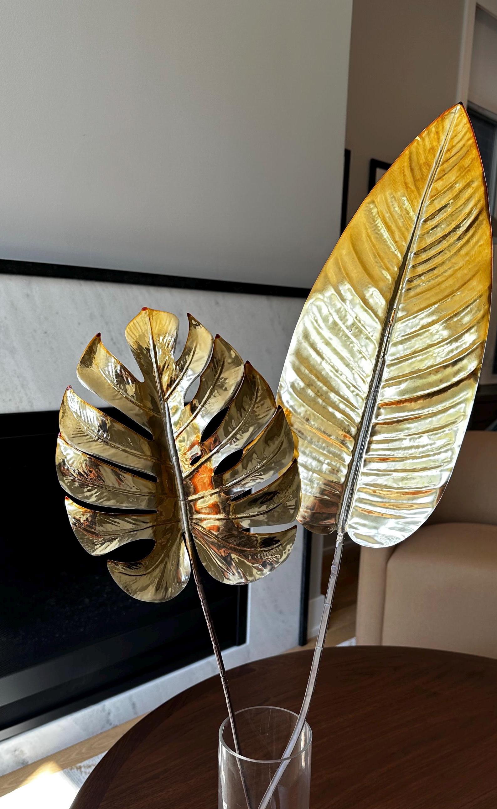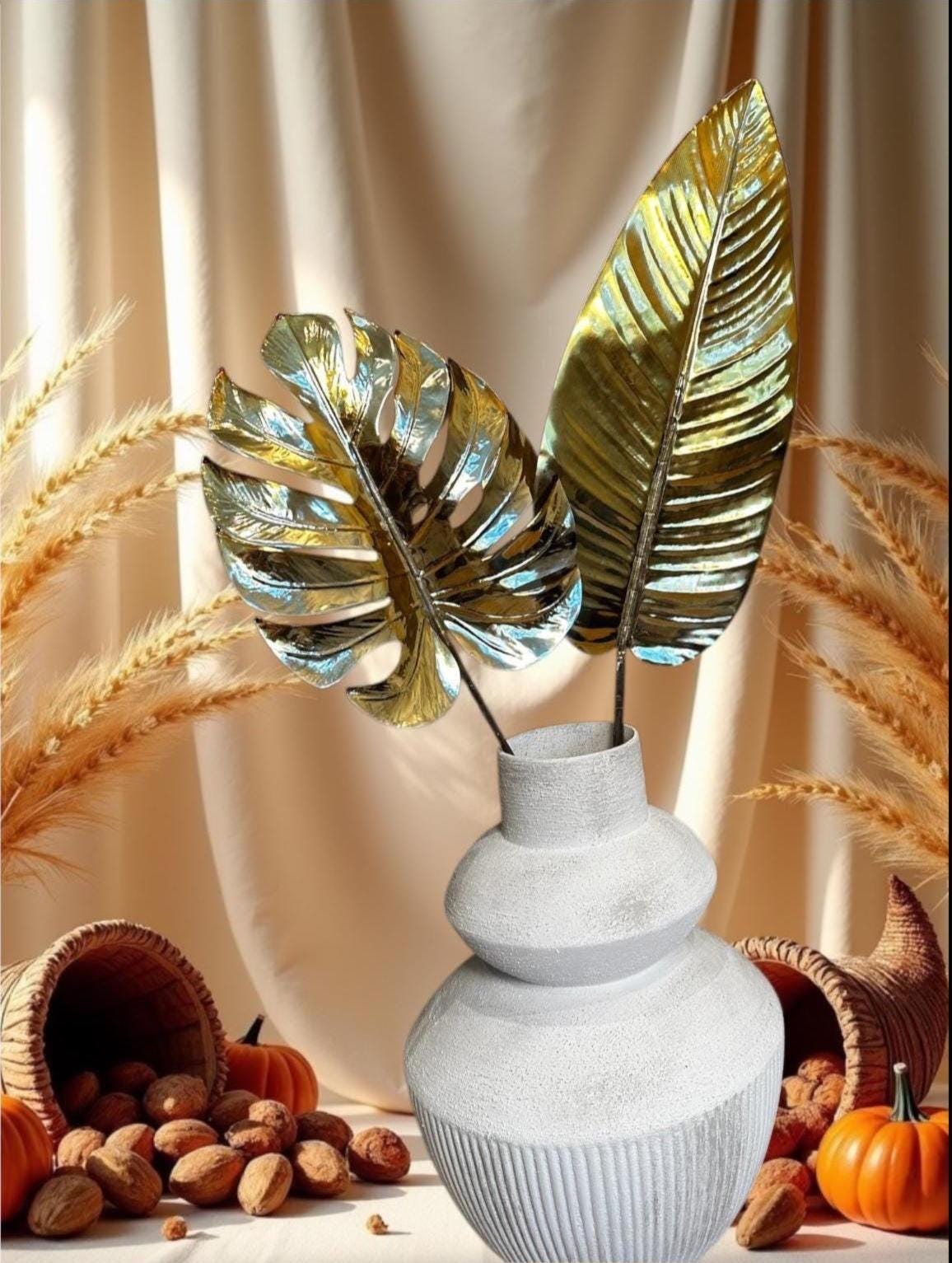 Transform your space with these oversized gold metallic leaves, a bold and modern statement piece that doubles as timeless home decor and elegant holiday styling. Handcrafted with a reflective golden finish, each leaf sculpture brings warmth, glamour, and sophistication to any room. Perfect for living rooms, entryways, dining tables, mantels, and office spaces, these versatile leaves look stunning in a vase, styled on a table, or mounted as wall art.