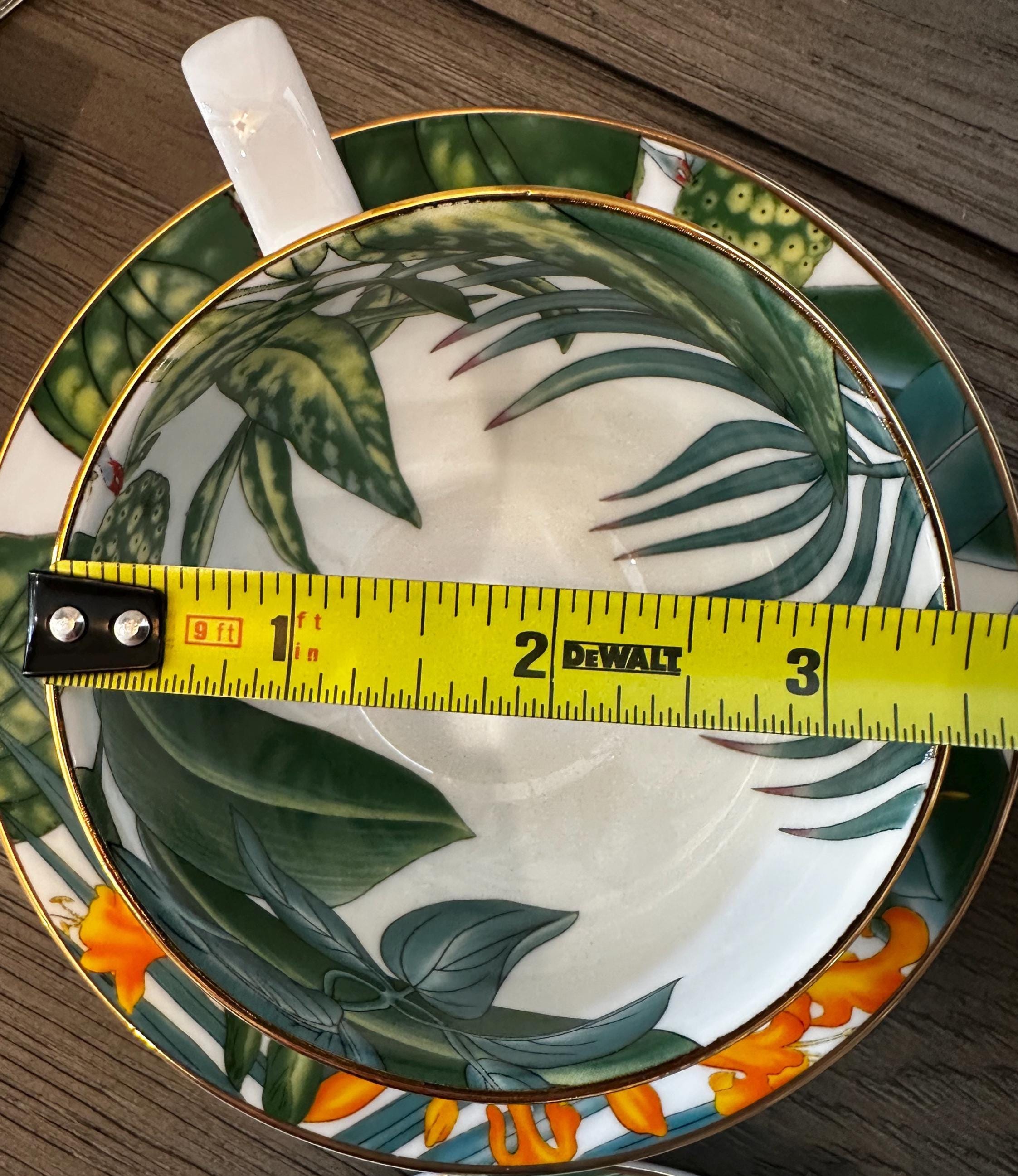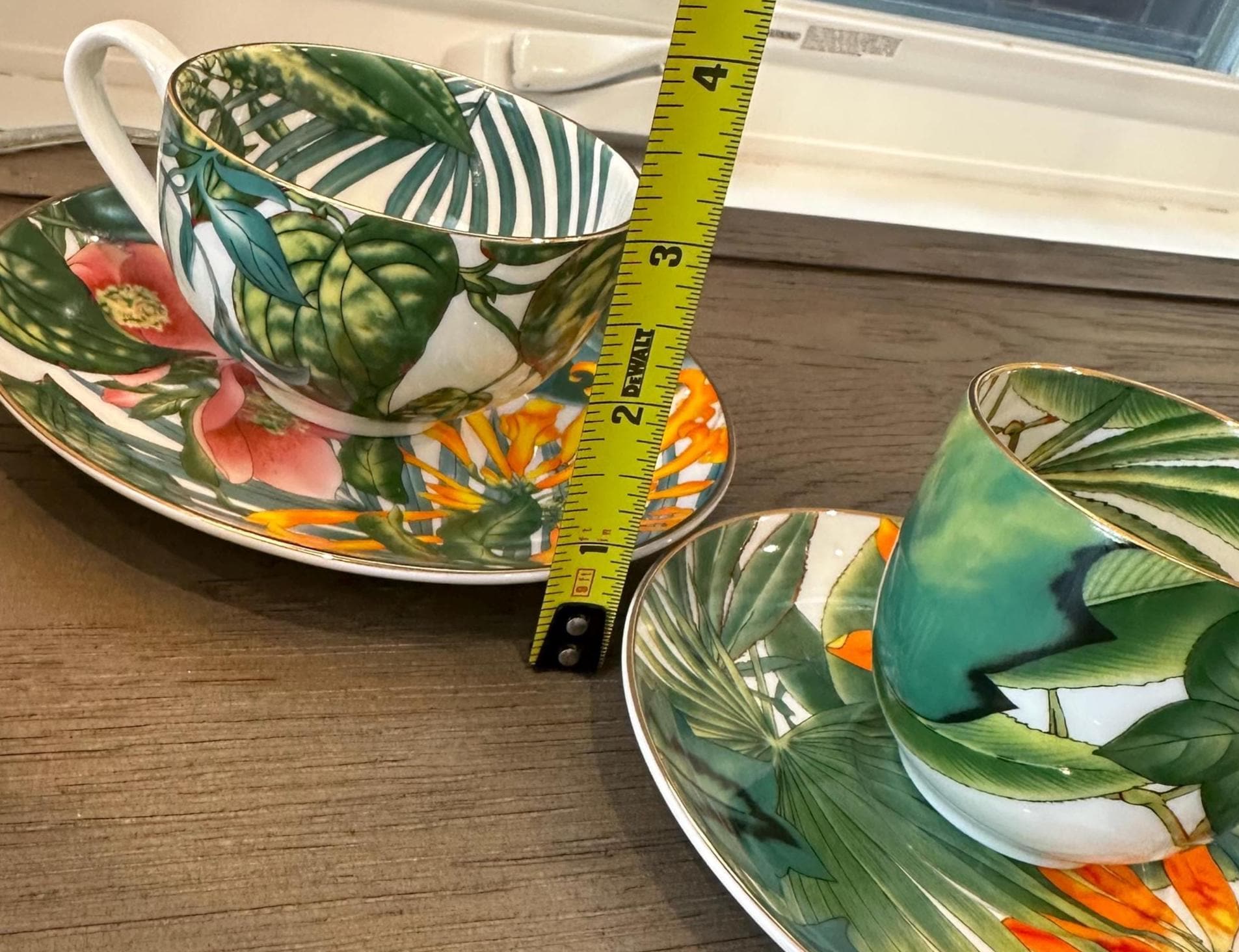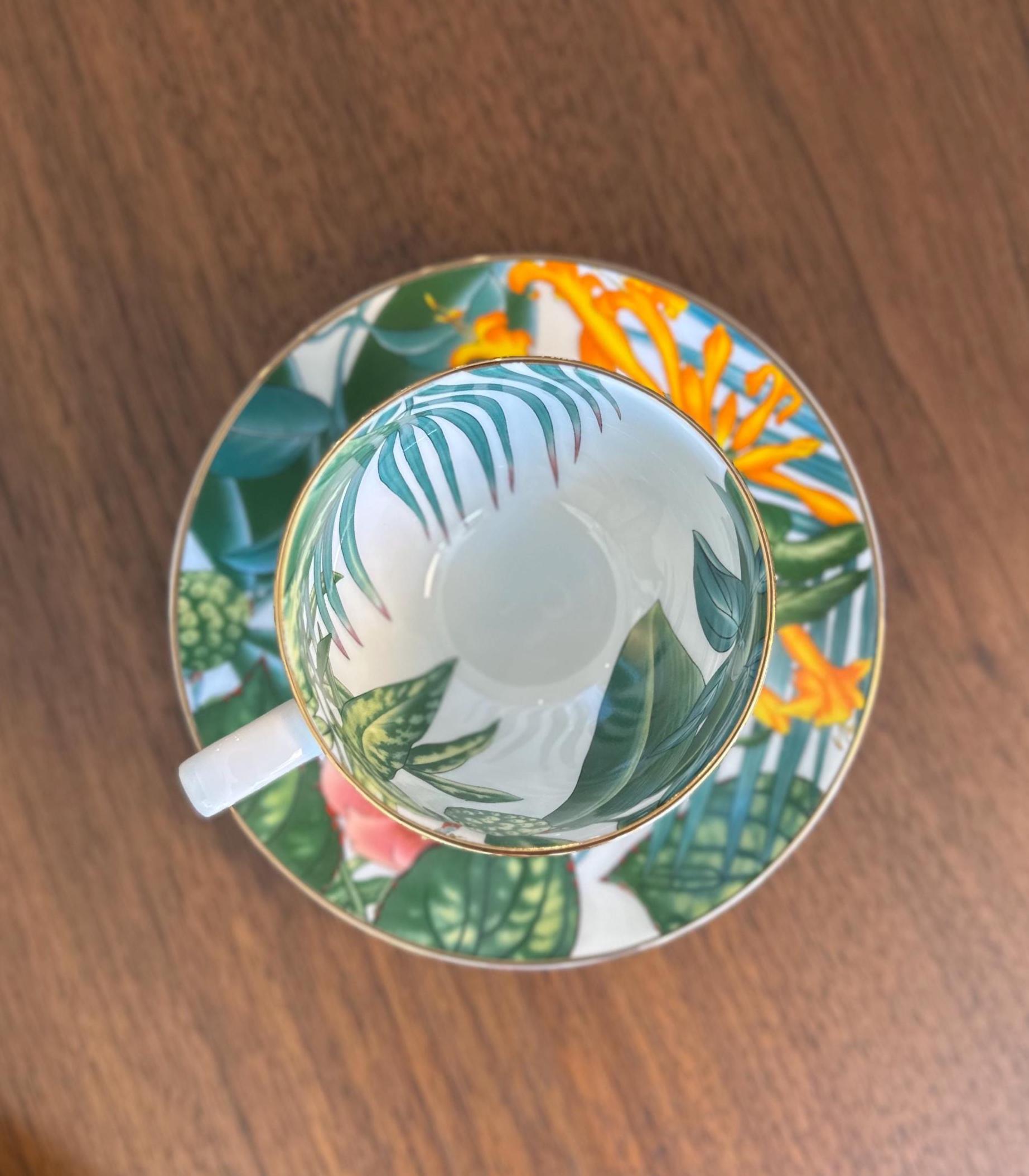 Featuring a vibrant tropical botanical design with lush green leaves and bright orange florals, each cup is paired with a matching saucer.