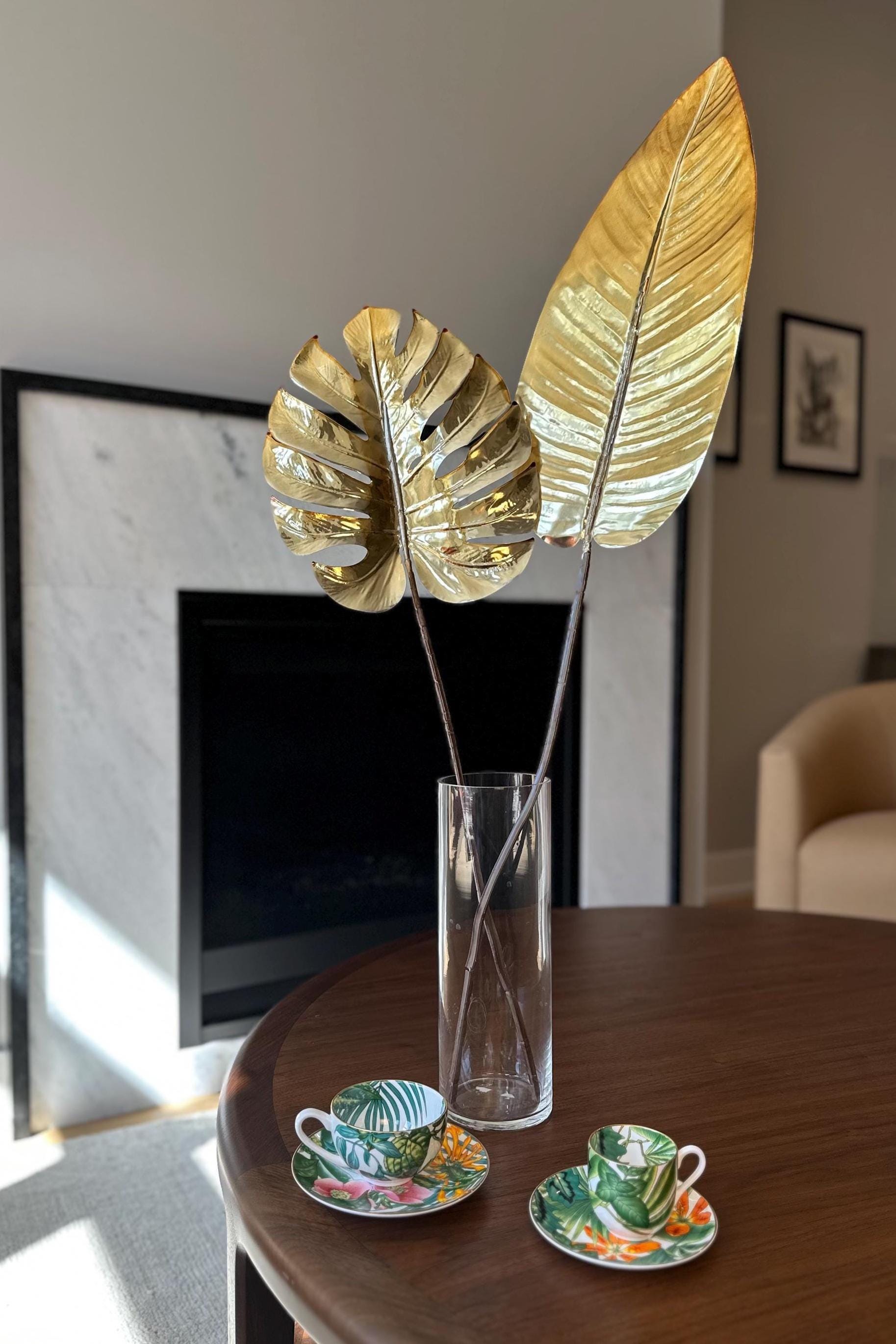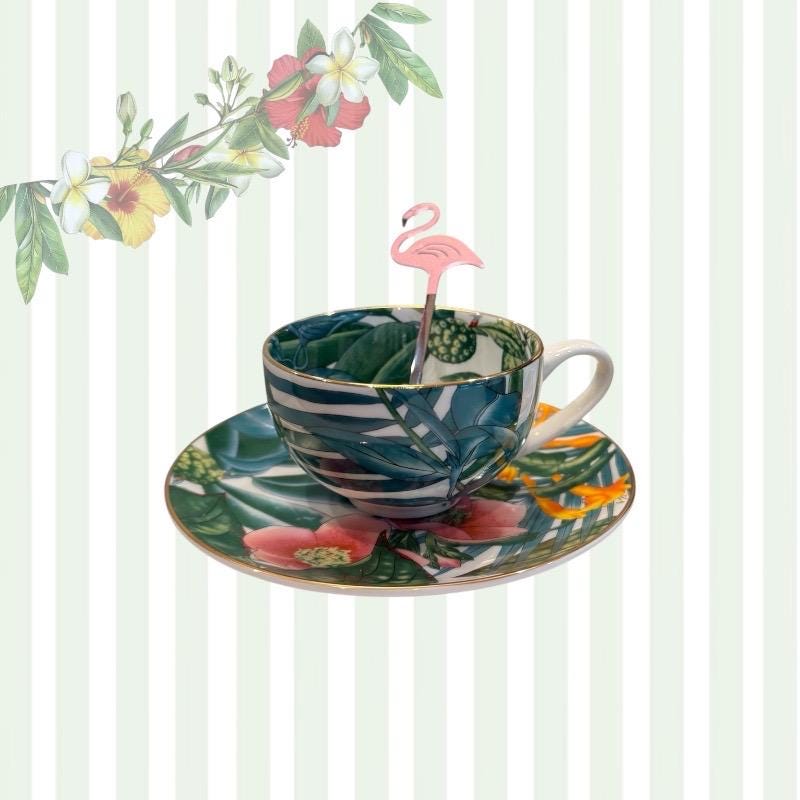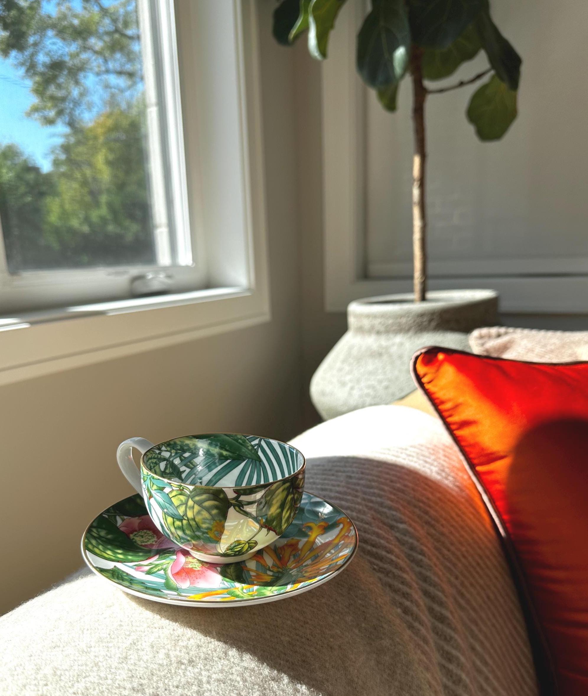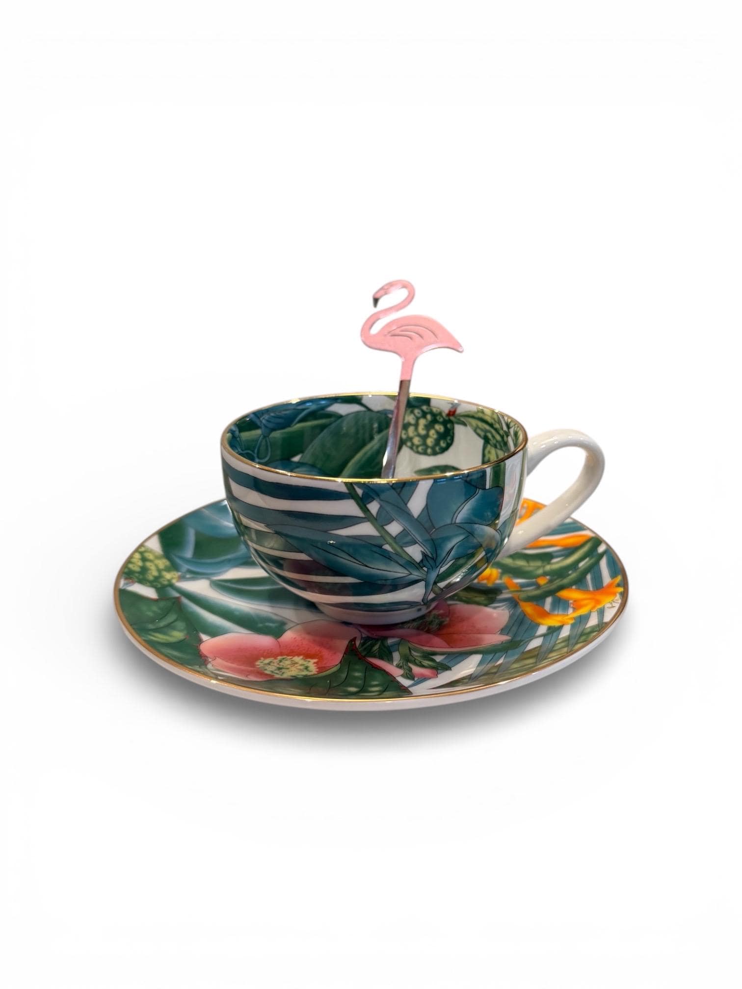 Featuring a vibrant tropical botanical design with lush green leaves and bright orange florals, each cup is paired with a matching saucer.
