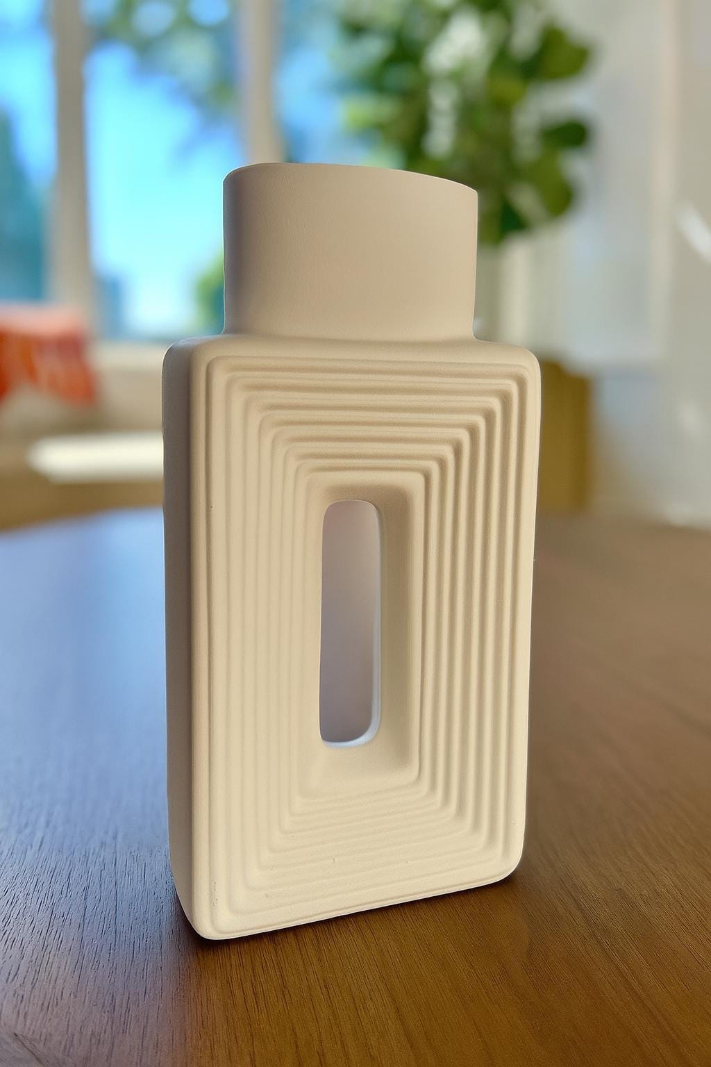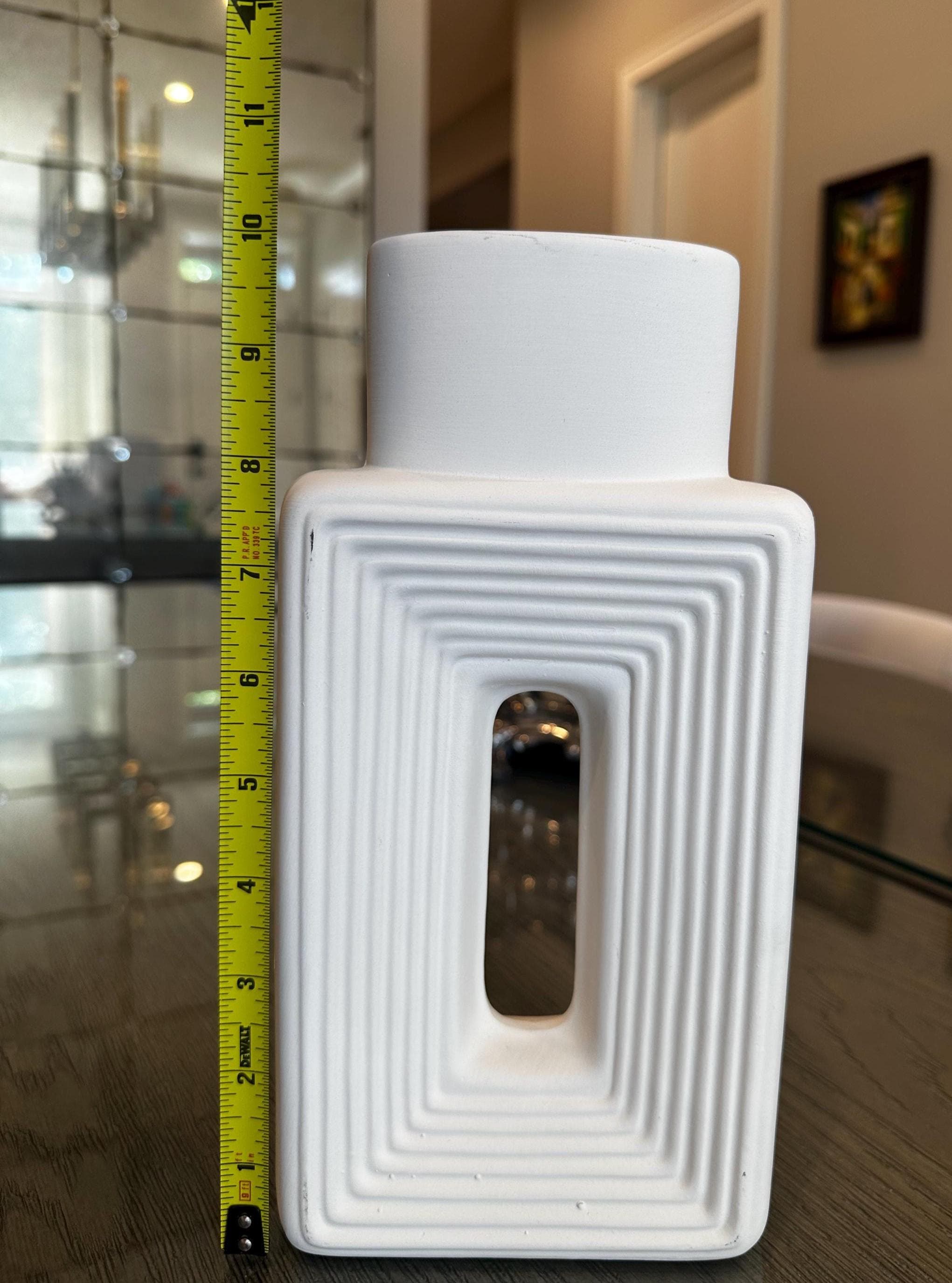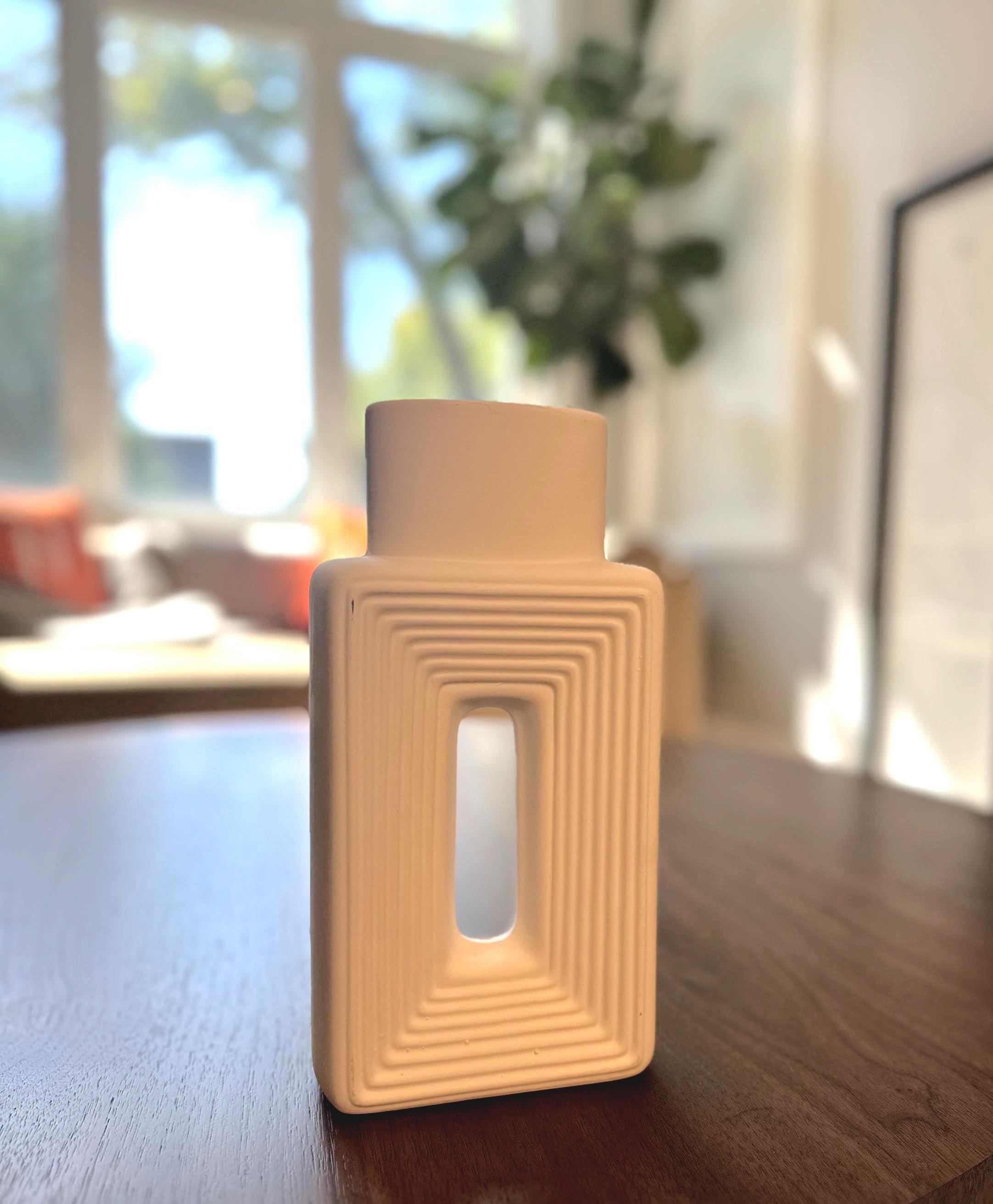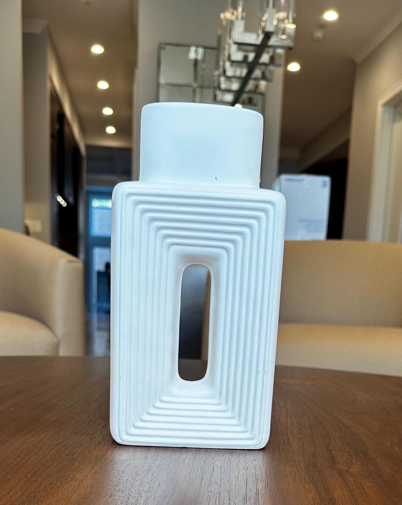 Bring modern elegance into your space with this geometric white ceramic vase. Featuring a sleek rectangular form, sculptural cut-out center, and textured ridges that draw the eye inward, this vase makes a stunning statement piece whether styled alone or filled with dried florals, pampas grass, or fresh greenery.