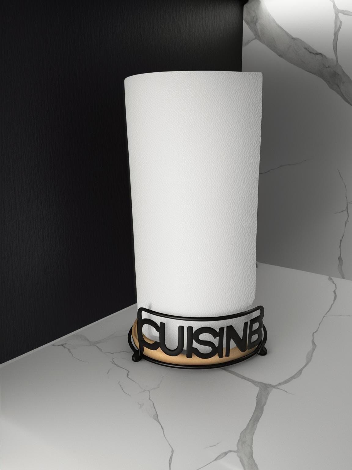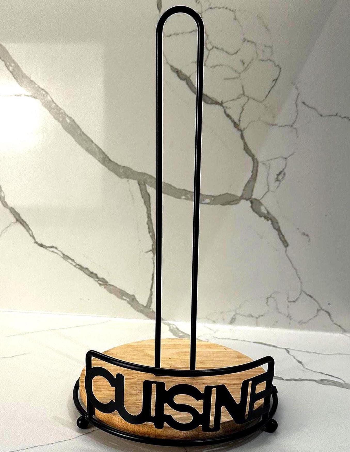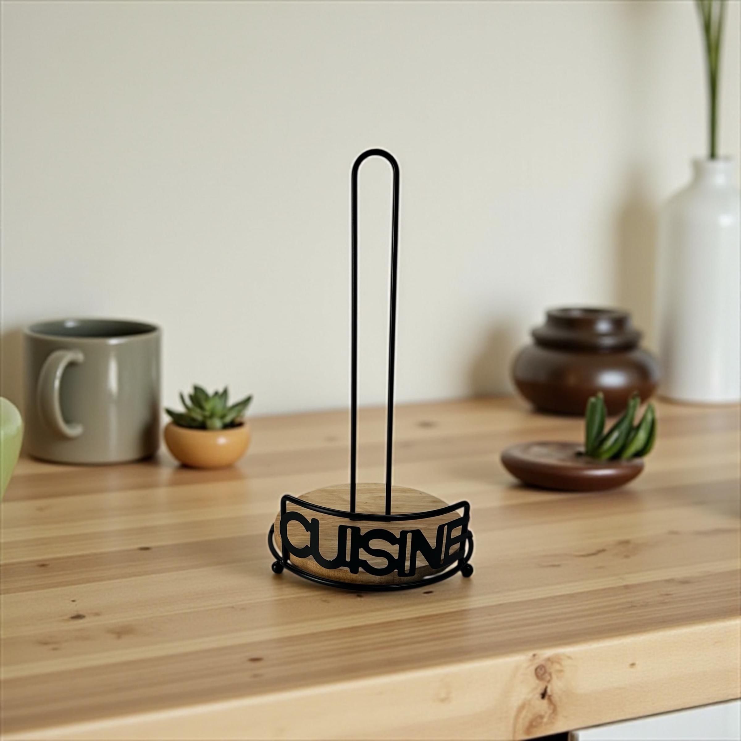 Add a stylish and practical touch to your kitchen with this freestanding paper towel holder. Featuring a solid wooden base and a sleek black metal frame with the word CUISINE across the front, this piece combines rustic charm with modern design.