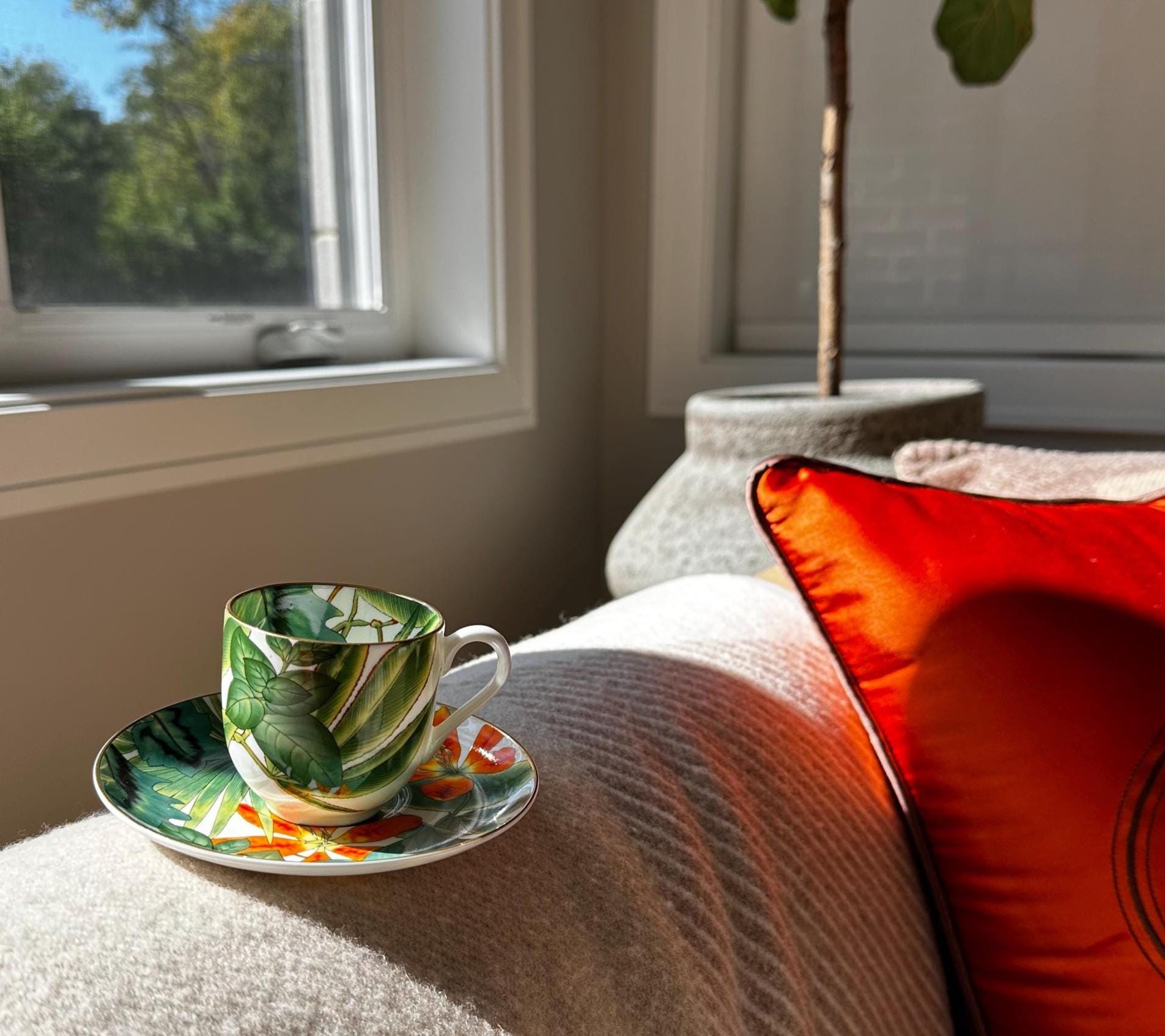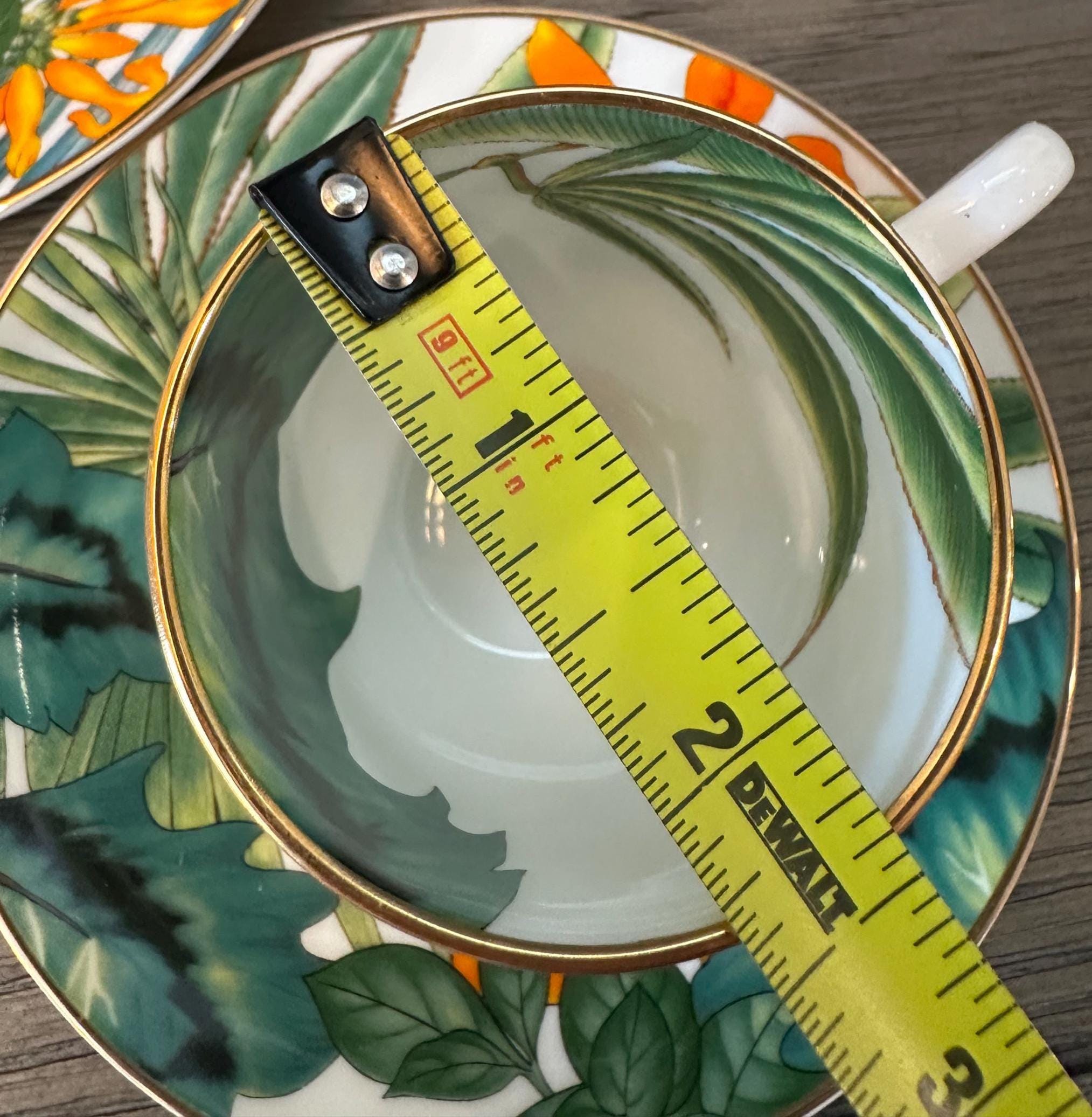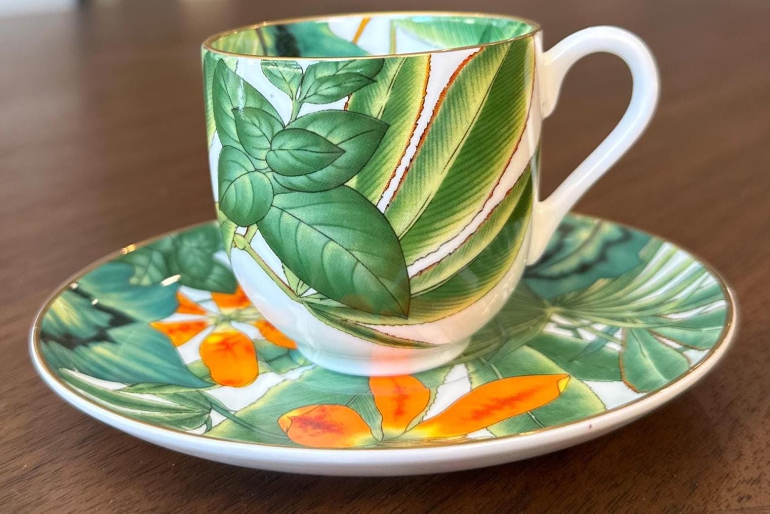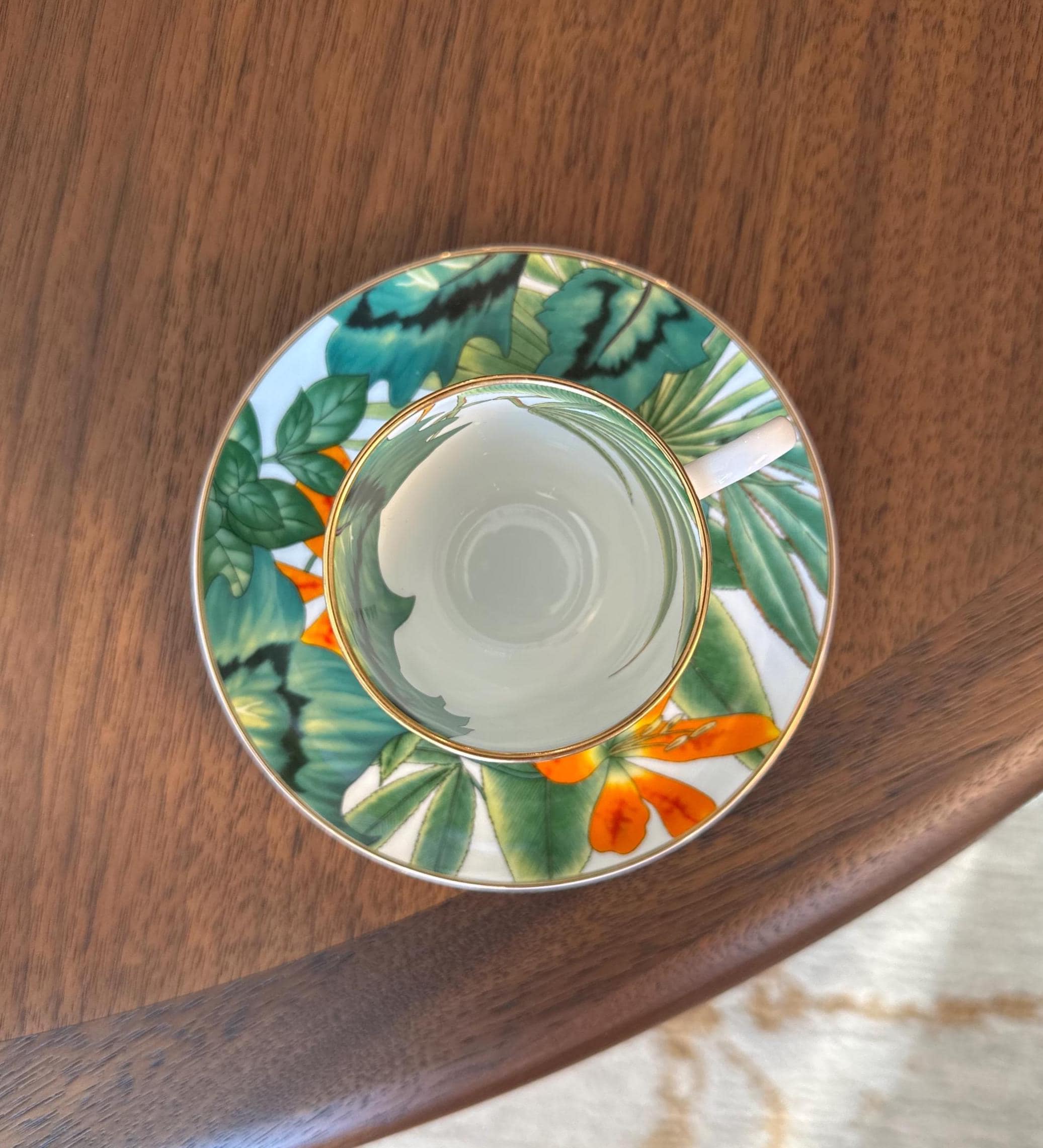 Featuring a vibrant tropical botanical design with lush green leaves and bright orange florals, each cup is paired with a matching saucer.