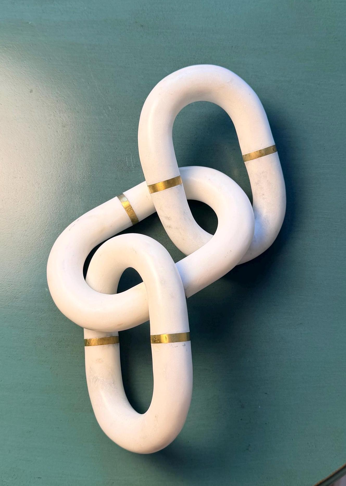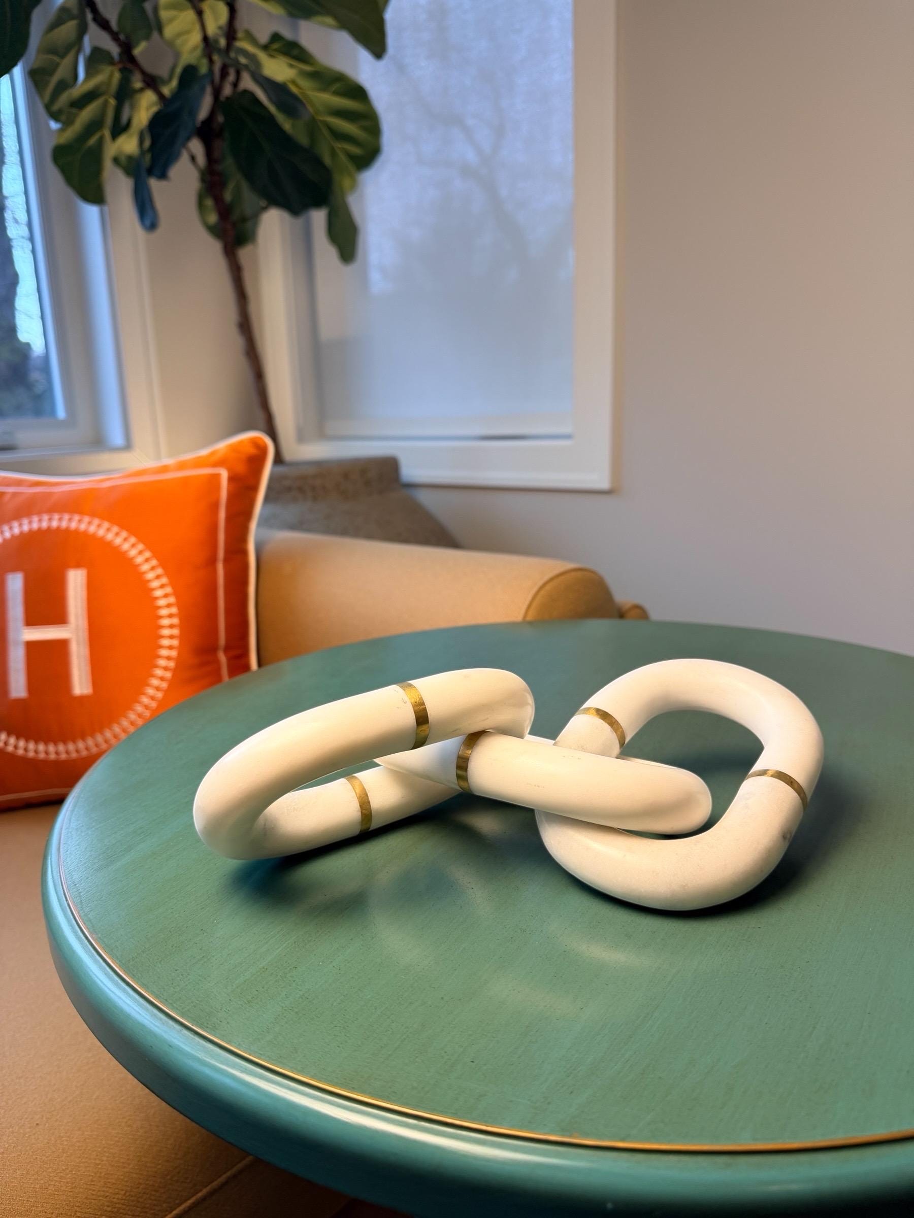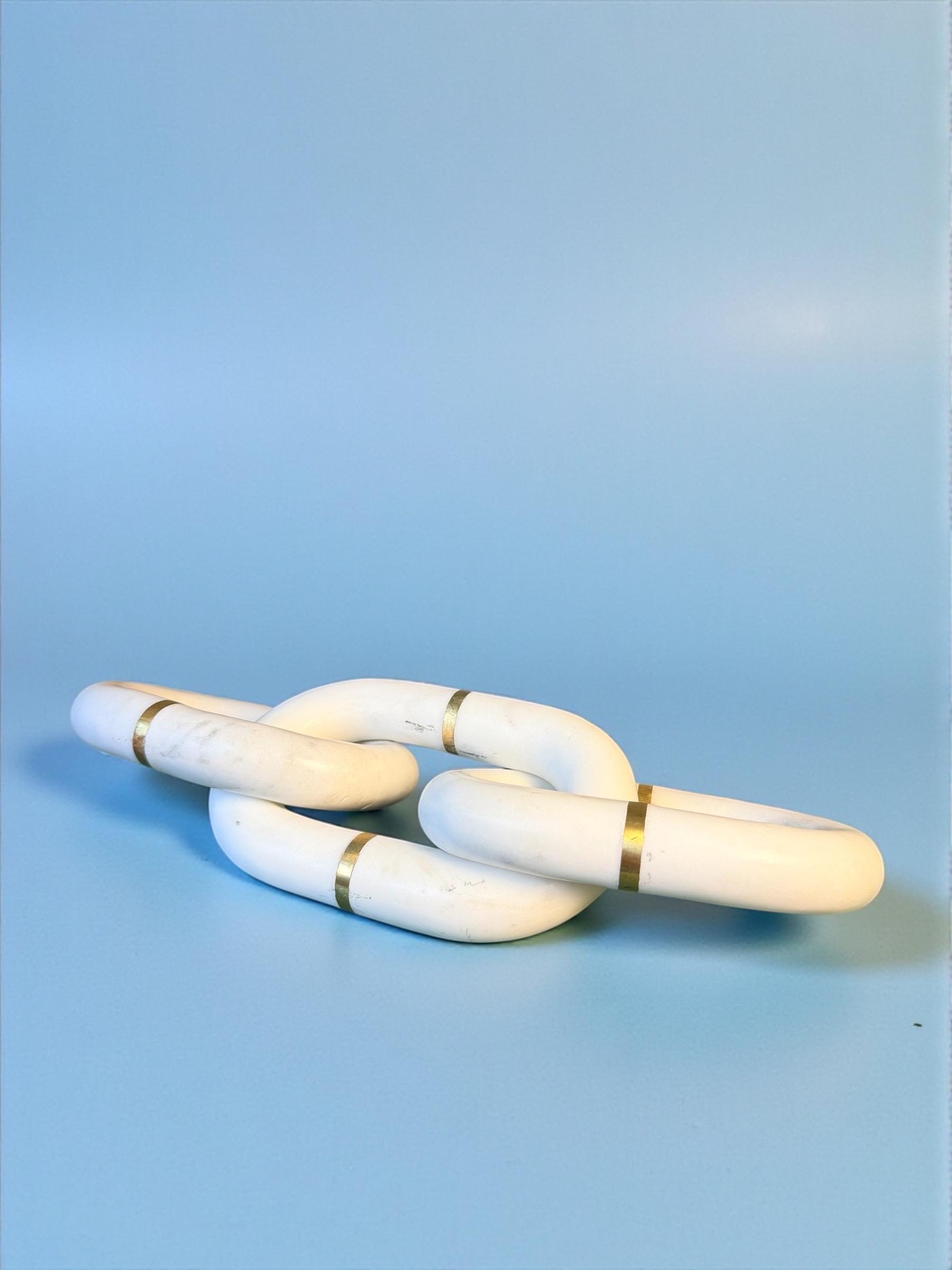 Introduce a touch of luxury to your space with this handcrafted Banswara Marble linked-chain sculpture, accented with engraved solid gold brass bands. Each link is carved from natural marble, giving it a smooth, cool, organic feel while the brass detailing adds a sophisticated shine.
