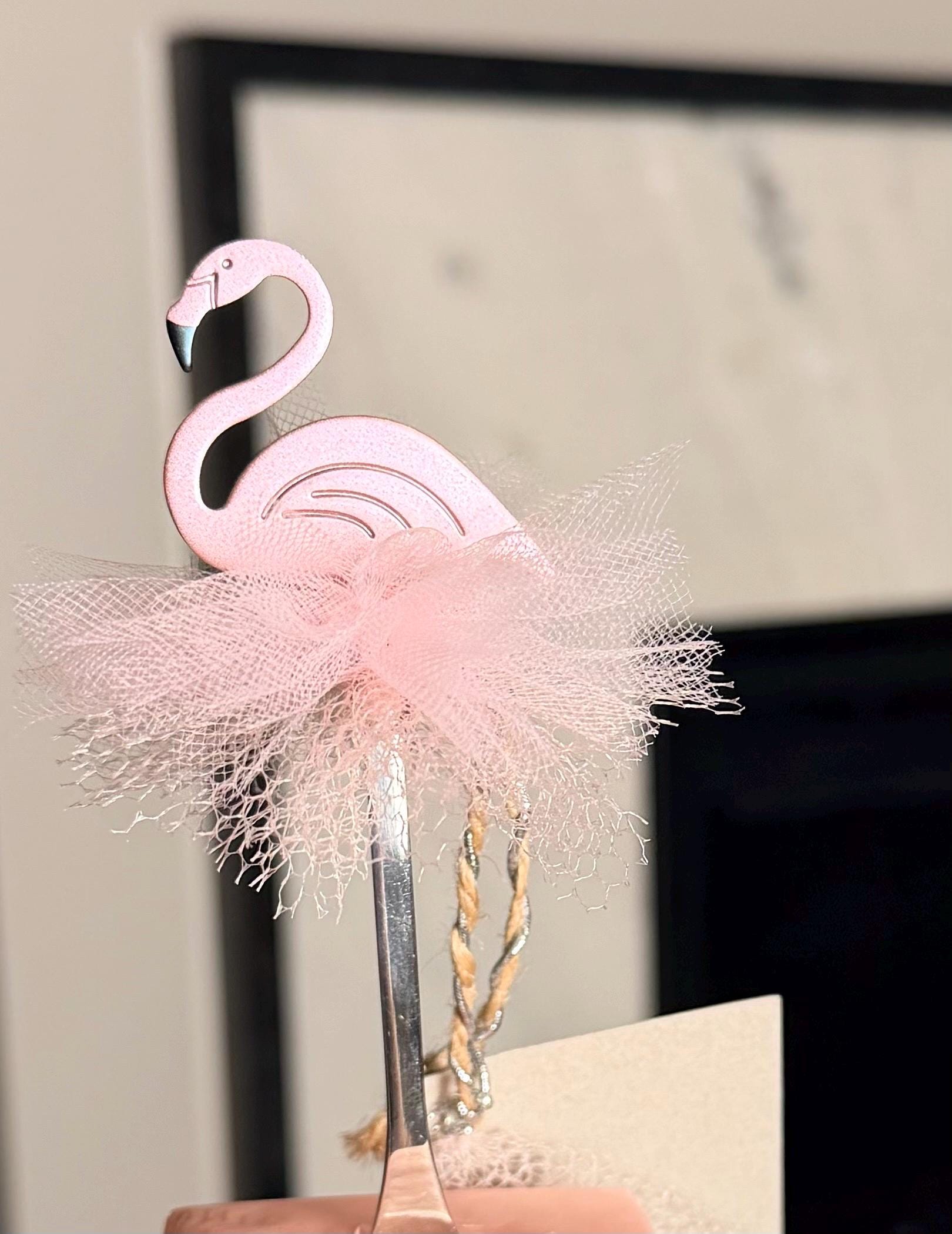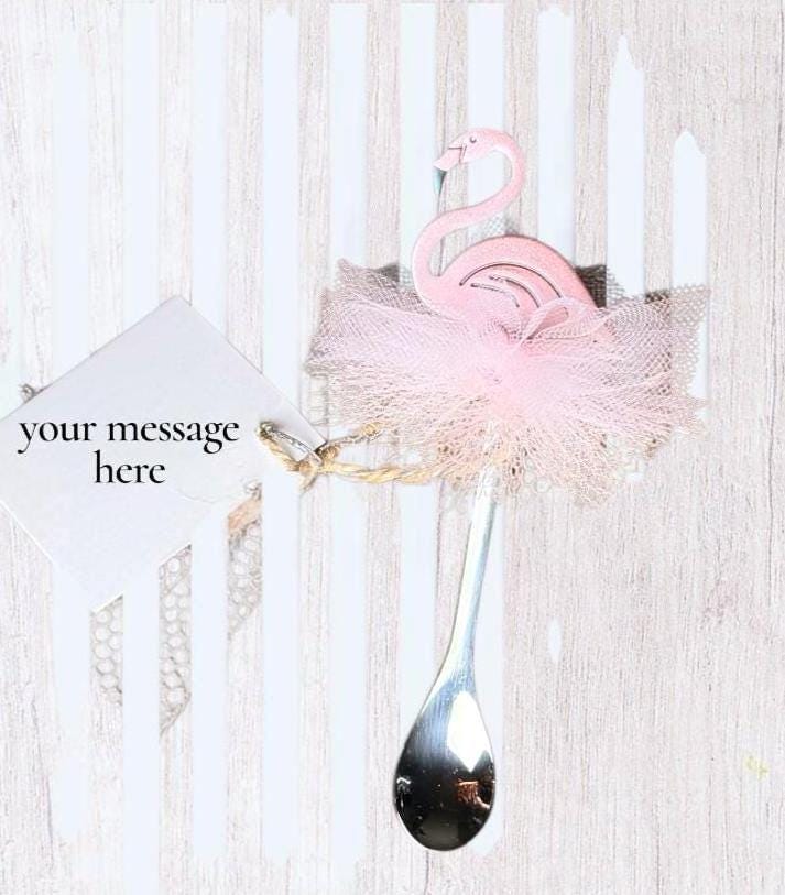 Add a charming touch to your celebration with these adorable pink flamingo spoon favors! Each piece features a sleek stainless-steel spoon paired with a delicate flamingo accent and fluffy tulle skirt— beautifully tied together with a rustic twine bow and optional personalized tag.