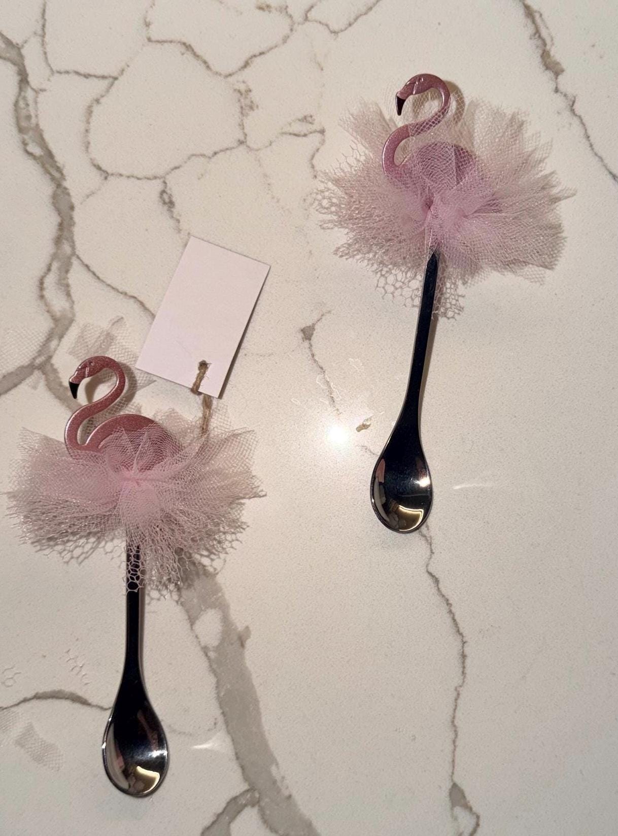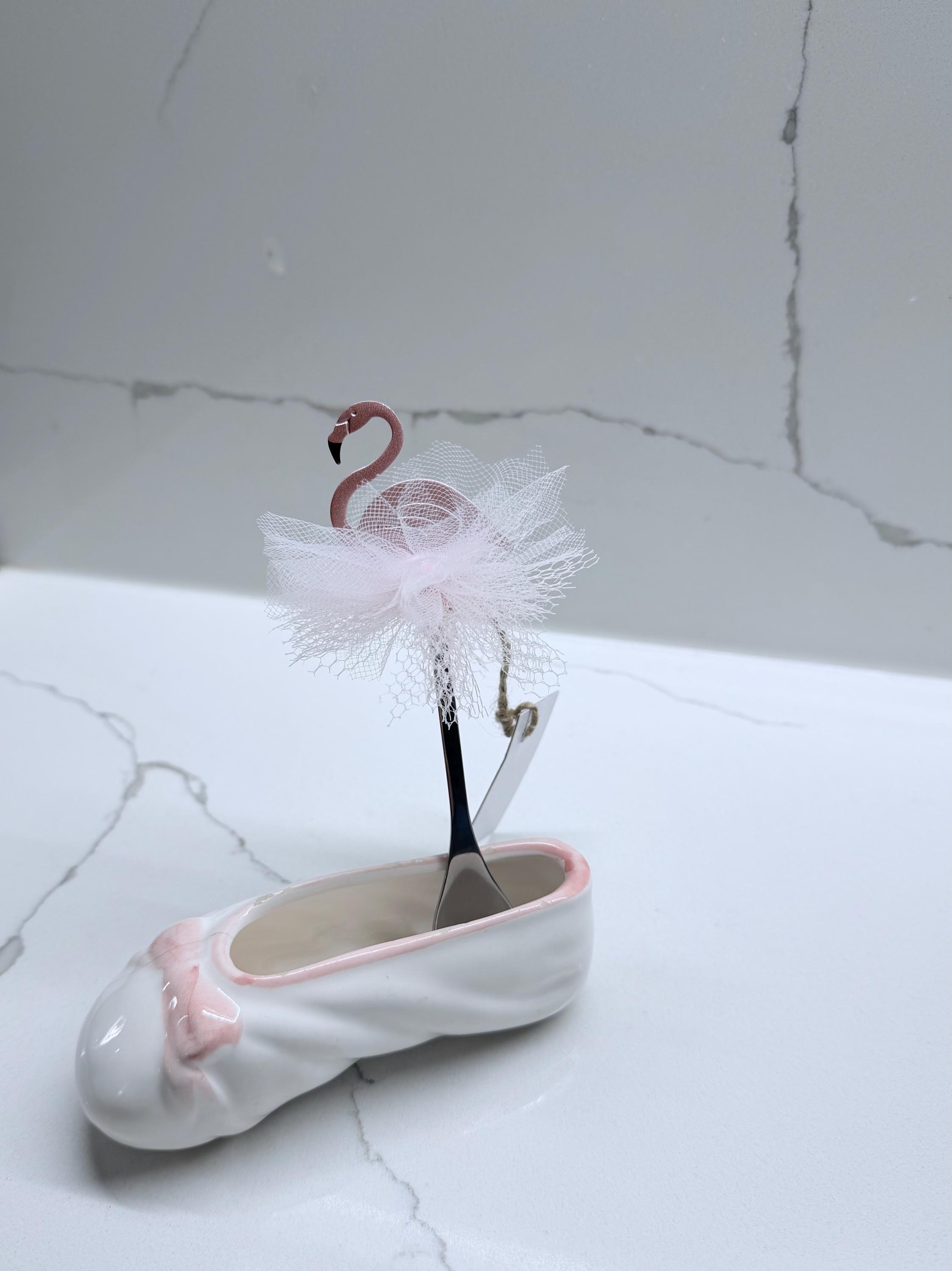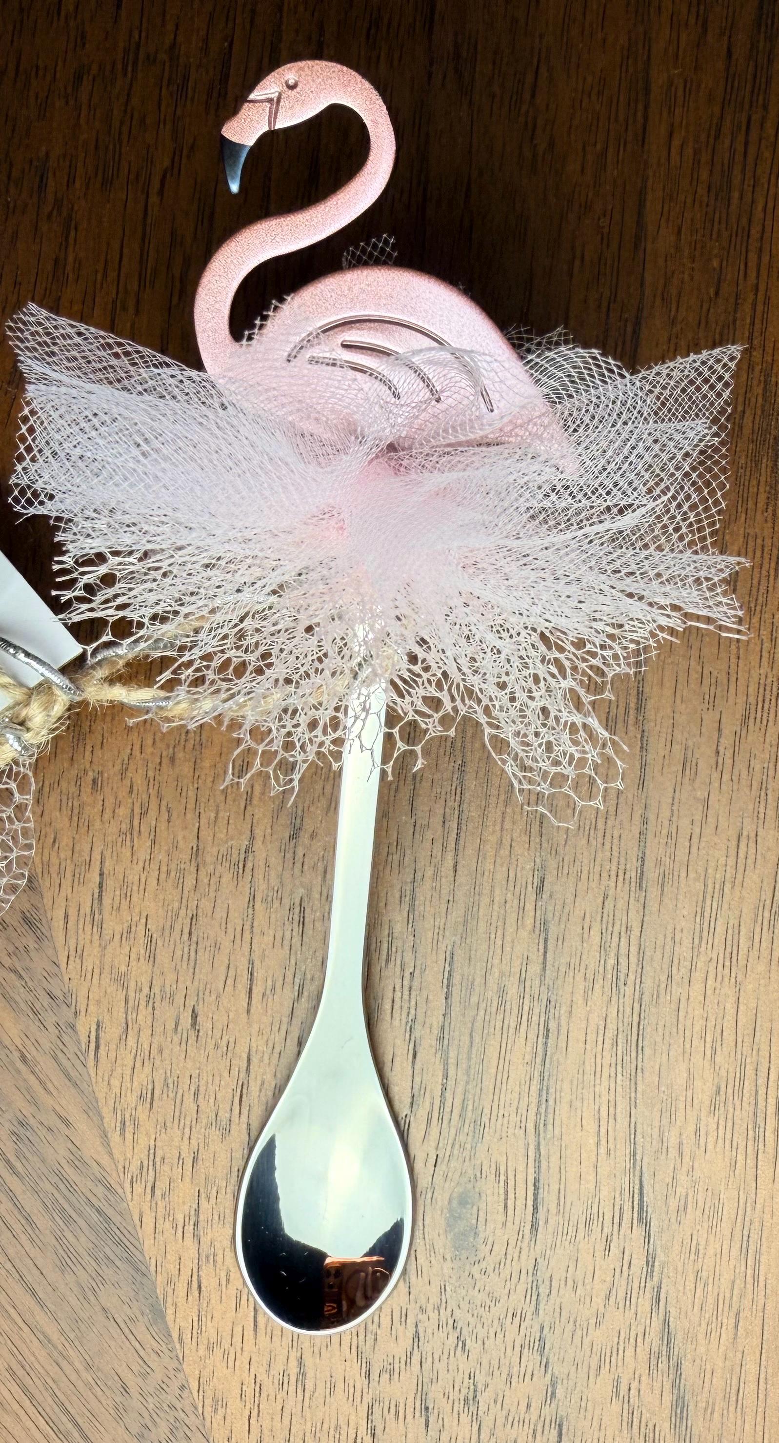 Pink Flamingo Decorative teaspoon Favor with tulle ballet skirt for Baby Showers, Birthdays, Bachelorettes & Tropical Themes